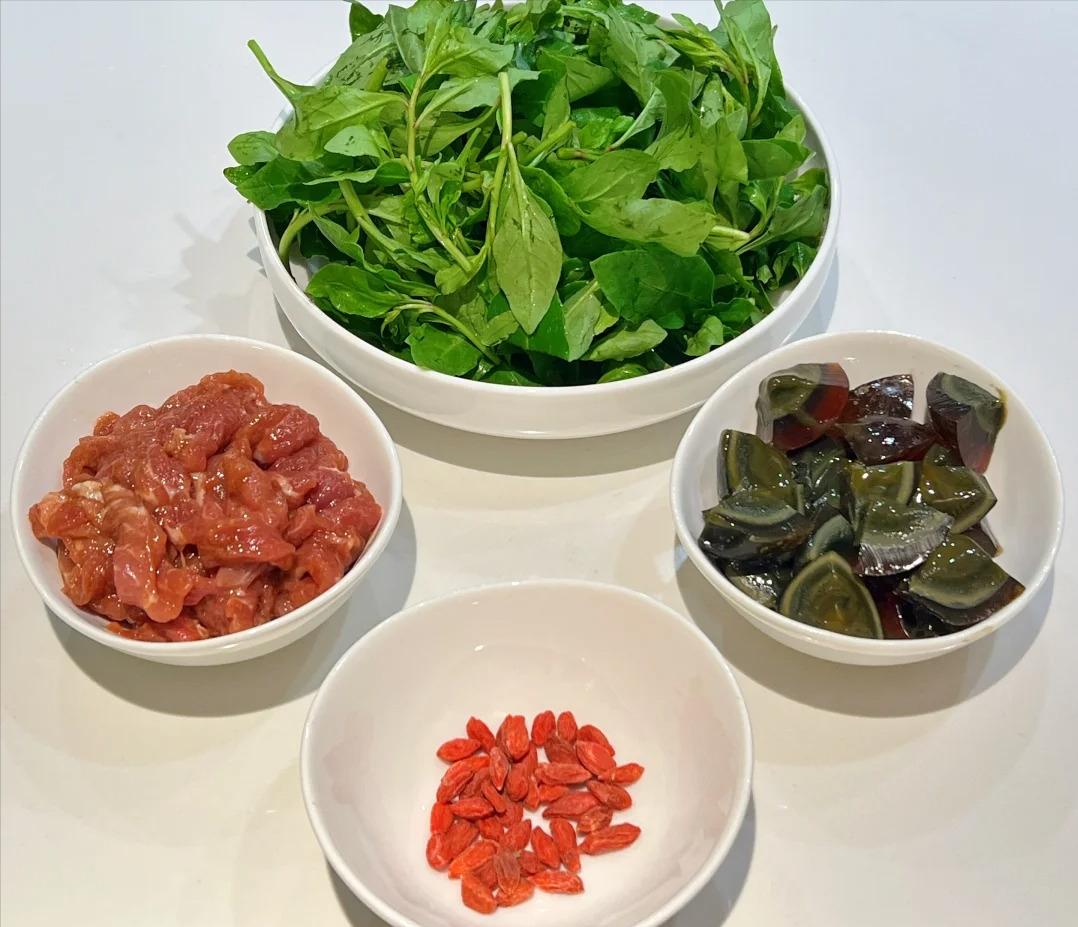食材: 300 克枸杞芽、50 克瘦肉、俩皮蛋、适量的枸杞
