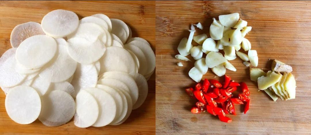 1、开始动手啦!先把白萝卜洗一洗,不用刮皮哈,萝卜皮营养可丰富着呢。然后切成薄片,姜和蒜也切成片,小米辣切成段。