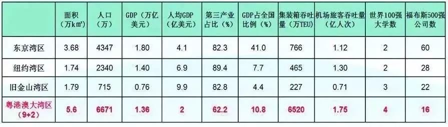 与世界其他三大湾区对比,粤港澳大湾区在人口、面积、港口吞吐量、旅客吞吐量、GDP增速等几个指标上,排名第一;经济总量,也已超过旧金山湾区,接近纽约湾区。