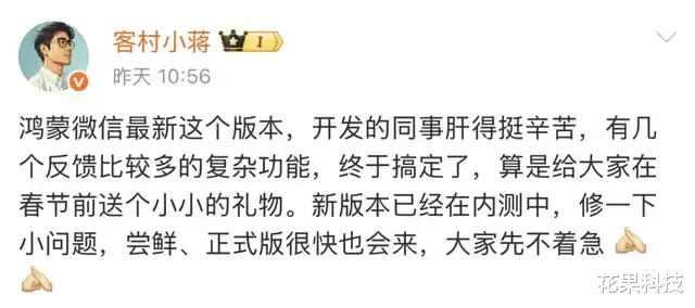 另外,用华为鸿蒙系统的小伙伴注意了,微信员工客村小蒋表示,即将发布的新版鸿蒙微信有几个反馈比较多的功能即将上线。