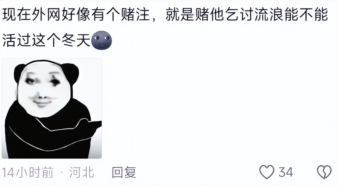 据说现在外网还有个赌注,就是赌他乞讨流浪能不能活过这个冬天。