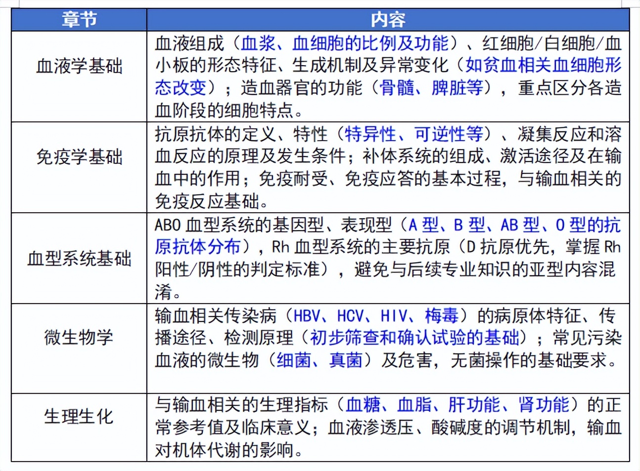 核心模块:血型血清学+成分血制备与保存+血液采集与冷链+输血相关检测技术,考纲要求“熟练掌握核心技术、理解操作原理”,是考试的“半壁江山”,各类题型均有涉及,难点在于血型鉴定、抗体筛查与鉴定的实操原理和异常结果分析。