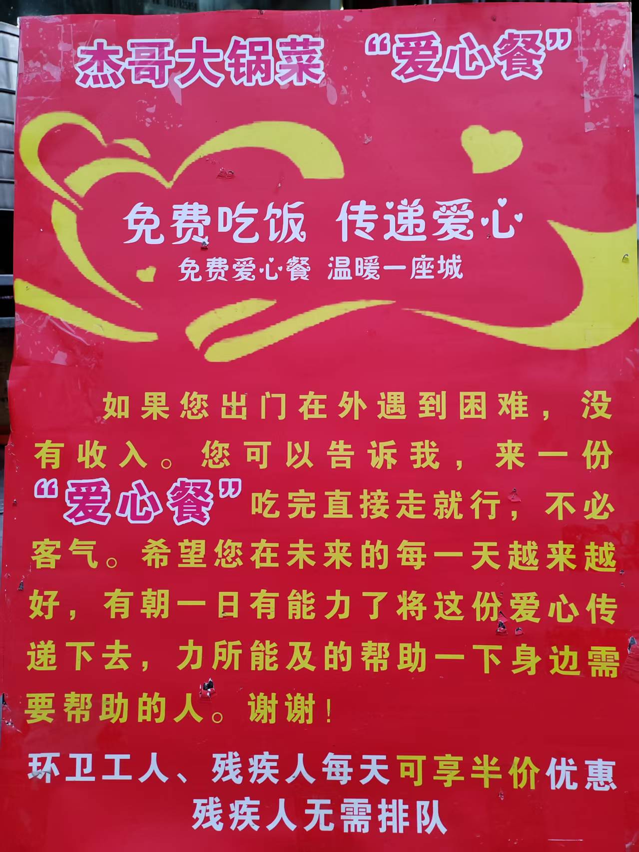 然而,真正让“杰哥大锅菜”脱颖而出的,并不仅仅是它的美味,而是它传递出的那份温情。餐馆老板仲会杰,是汝南县第七届道德模范。他在店内醒目位置张贴了一则“爱心餐”告示:“如果您出门在外遇到困难,没有收入,您可以告诉我,来一份‘爱心餐’,吃完直接走就行,不必客气。希望您在未来的每一天越来越好,有朝一日有能力了将这份爱心传递下去,力所能及地帮助一下身边需要帮助的人。”