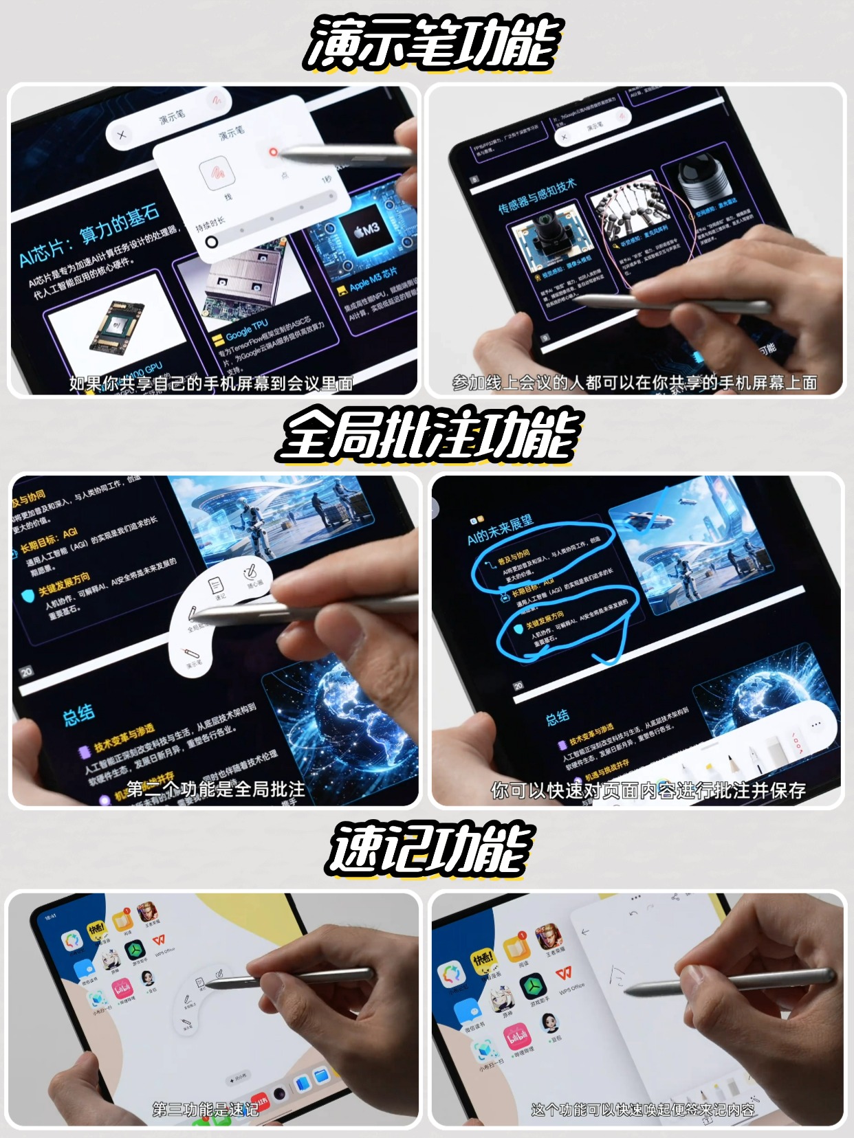除此之外,OPPO AI手写笔还为经常需要开会议的用户开发了演示笔功能,支持实时圈选、全局批注以及速记,非常高效方便,基本上会议上常见的操作需求,OPPO Find N6+AI手写笔都能搞定。