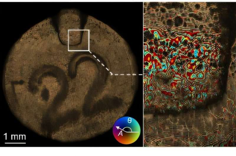 示例:由 MASI 成像的子弹弹壳 上图:捕获到的复数电场包含振幅(亮度)与相位(色彩)信息。 下图:利用这些数据在数值上恢复三维结构,精细到微米级,显示击针印记——可将弹壳与特定枪匹配的唯一标记。 图:康涅狄格州立大学