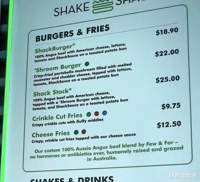 赛事官方菜单照片在社交媒体疯传,其中Shack Stack汉堡定价25澳元(约117元人民币),干酪薯条一份12.5澳元(约58元人民币),奶昔更高达13.9澳元(约65元人民币)。若再加购一瓶5.95澳元(约28元人民币)的矿泉水,球迷单次消费极易突破50澳元大关。