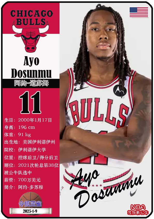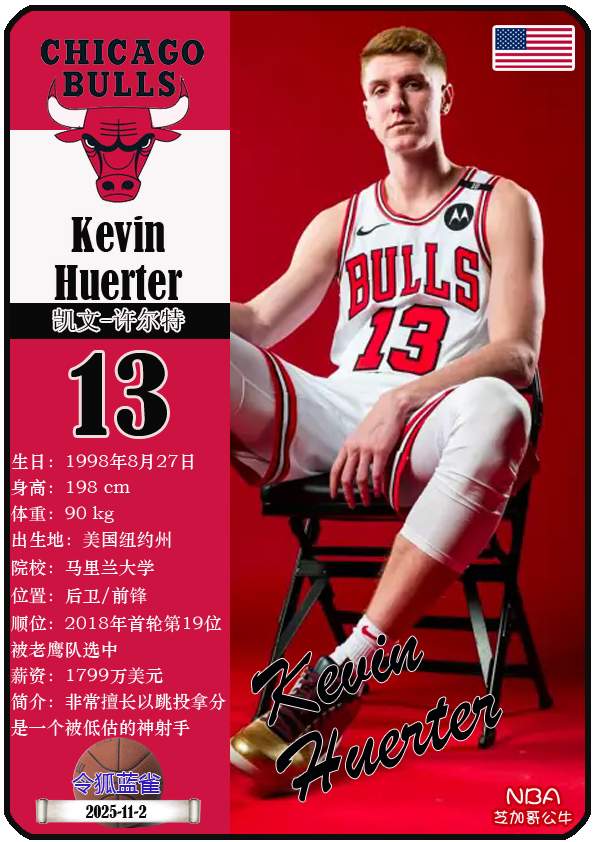 NBA芝加哥公牛队成立于1966年,距今已有59年历史。截至2025年11月2日,球队主教练是比利·多诺万,队内拥有球员约什-基迪、尼克拉-武切维奇、扎克-科林斯等。本期以球星卡的形式展示目前NBA芝加哥公牛队的18名球员(按球衣号码排序):