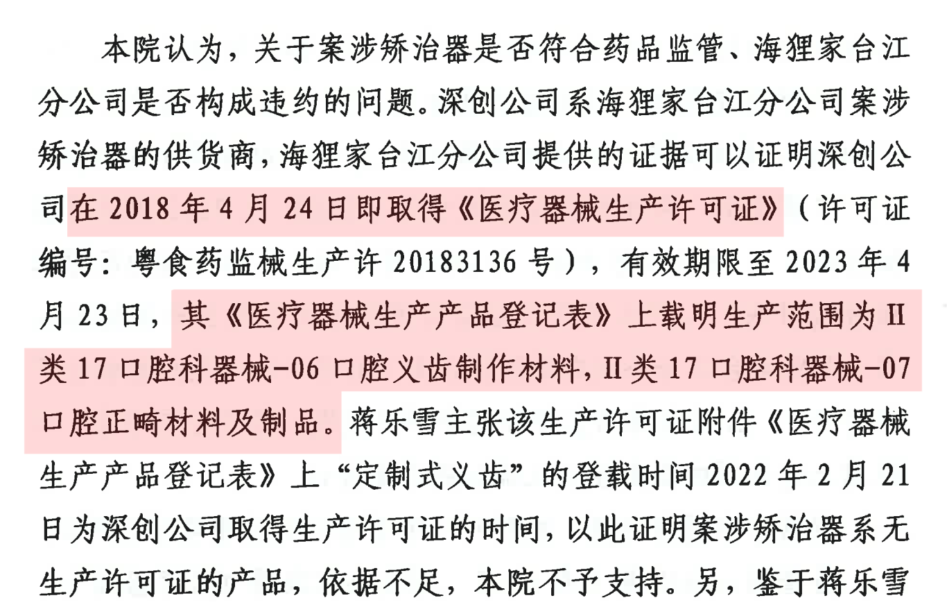 首先,徐晶在(2024)闽01民终73号民事判决书、傅建勇(2024)闽0103民初5562号民事判决书将2022年2月21日前不具备II类17口腔科器械-07 口腔正畸材料及制品的深圳市深创义齿技术有限公司提前至了2018年4月24日使其具备生产“定制式矫治器”生产资质,并认定案涉矫治器“系有生产许可的产品”。徐晶在(2024)闽01民终73号民事判决书、傅建勇(2024)闽0103民初5562号民事判决书的信息,展示如下: