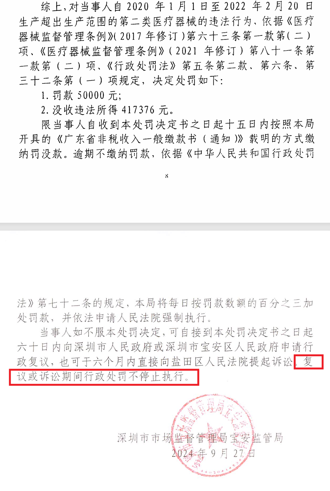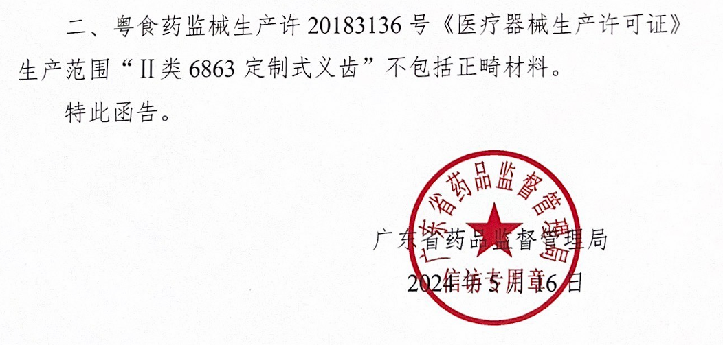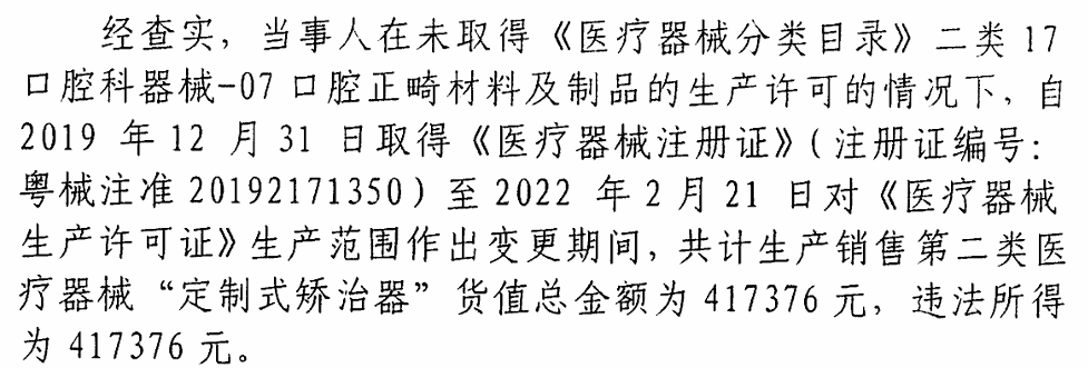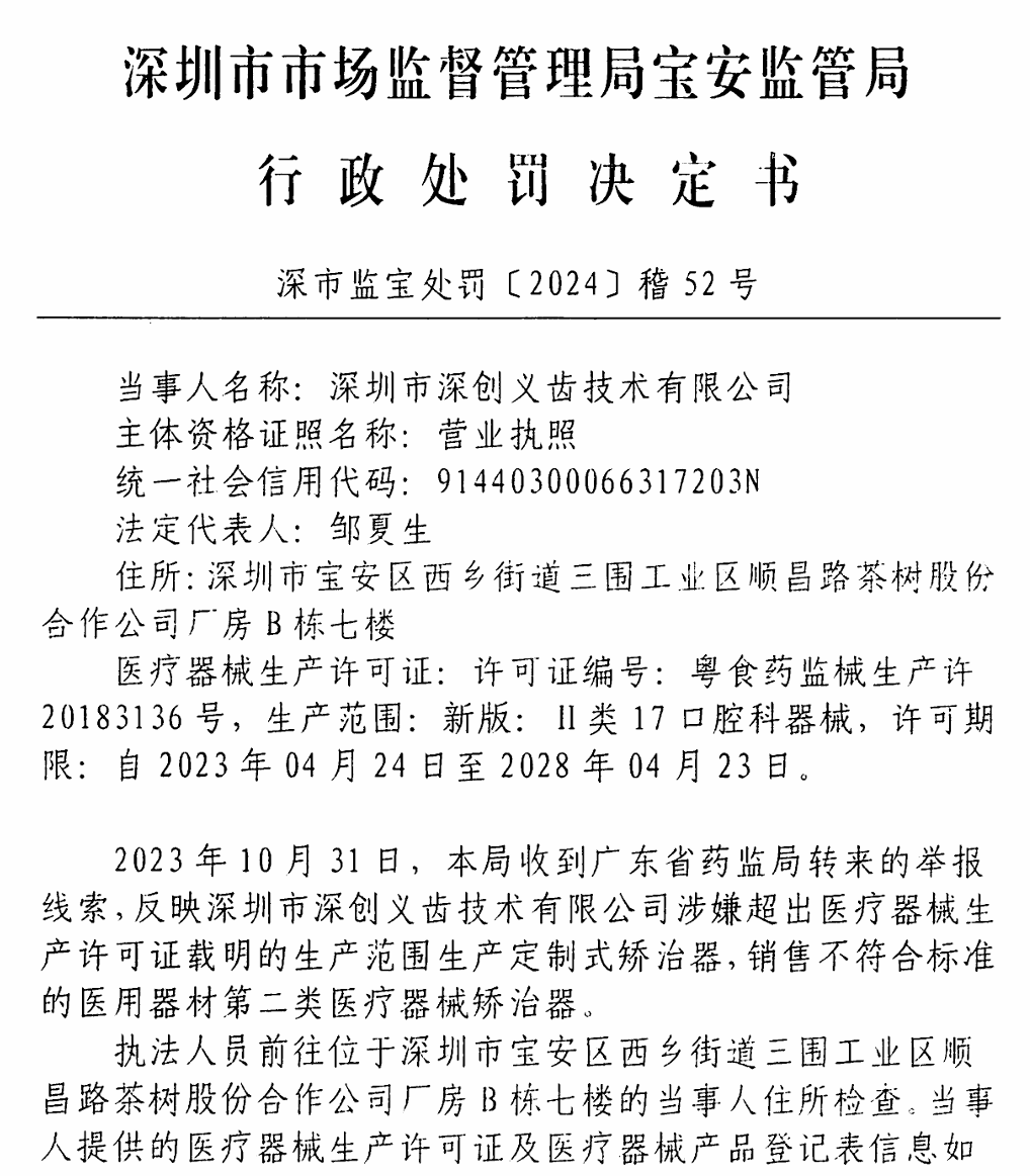 深圳市市场监督管理局宝安监管局于2024年9月27日作出:行政处罚决定书文号:深市监宝处罚〔2024稽52号,深创义齿未取得《医疗器械分类目录》二类17口腔科器械-07口腔正畸材料及制品的生产许可的情况下,自2019年12月31日取得《医疗器械注册》(注册证编号:粤些注准20192171350)至2022年2月21日对《医疗器械生产许可证》生产范围作出变更期间,共计生产销售第二类医疗器械“定制式矫治器”货值总金额为417376元,违法所得为417376元。深市监宝处罚〔2024稽52号行政处罚决定书载明如下: