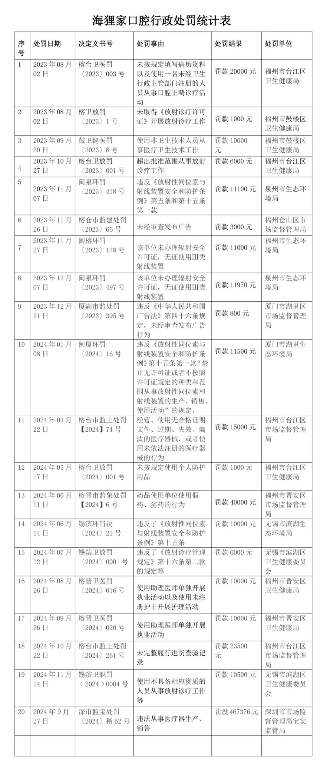 海狸家口腔违法行为,被行政机关处罚的统计表如下: