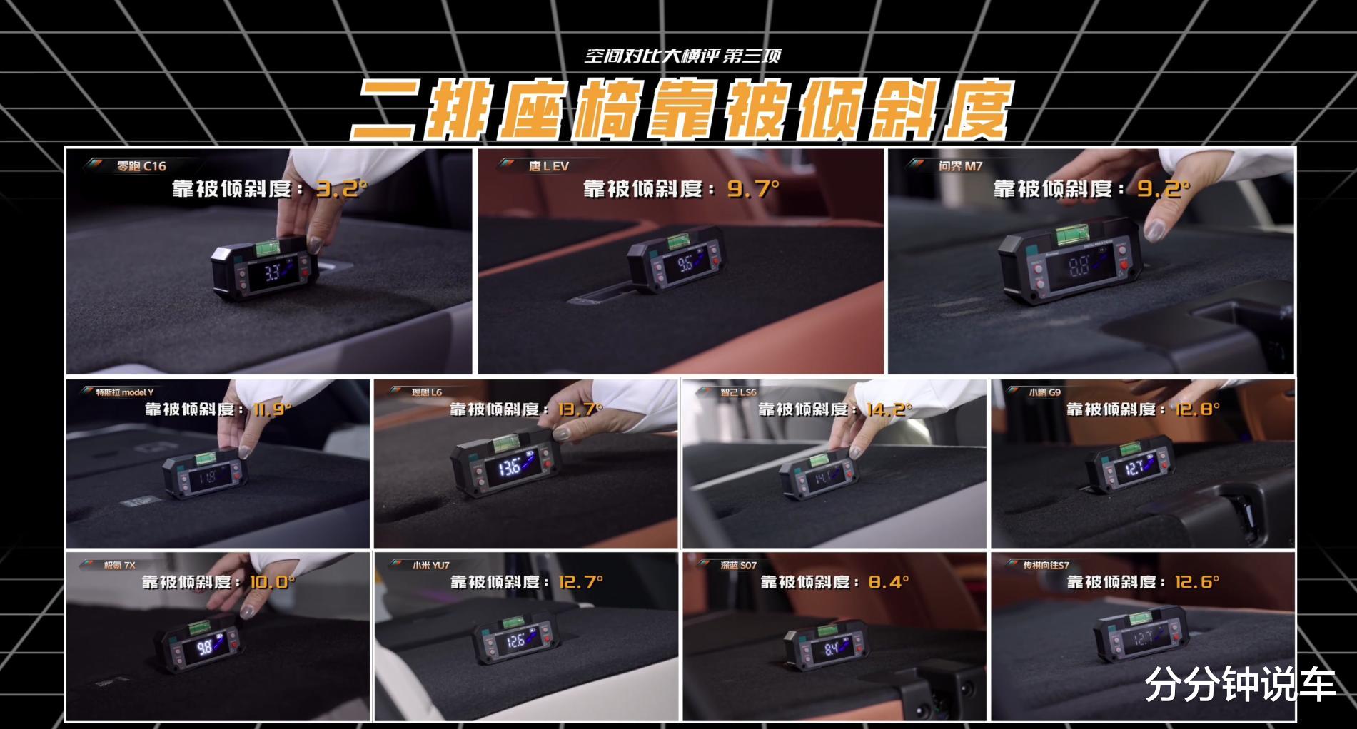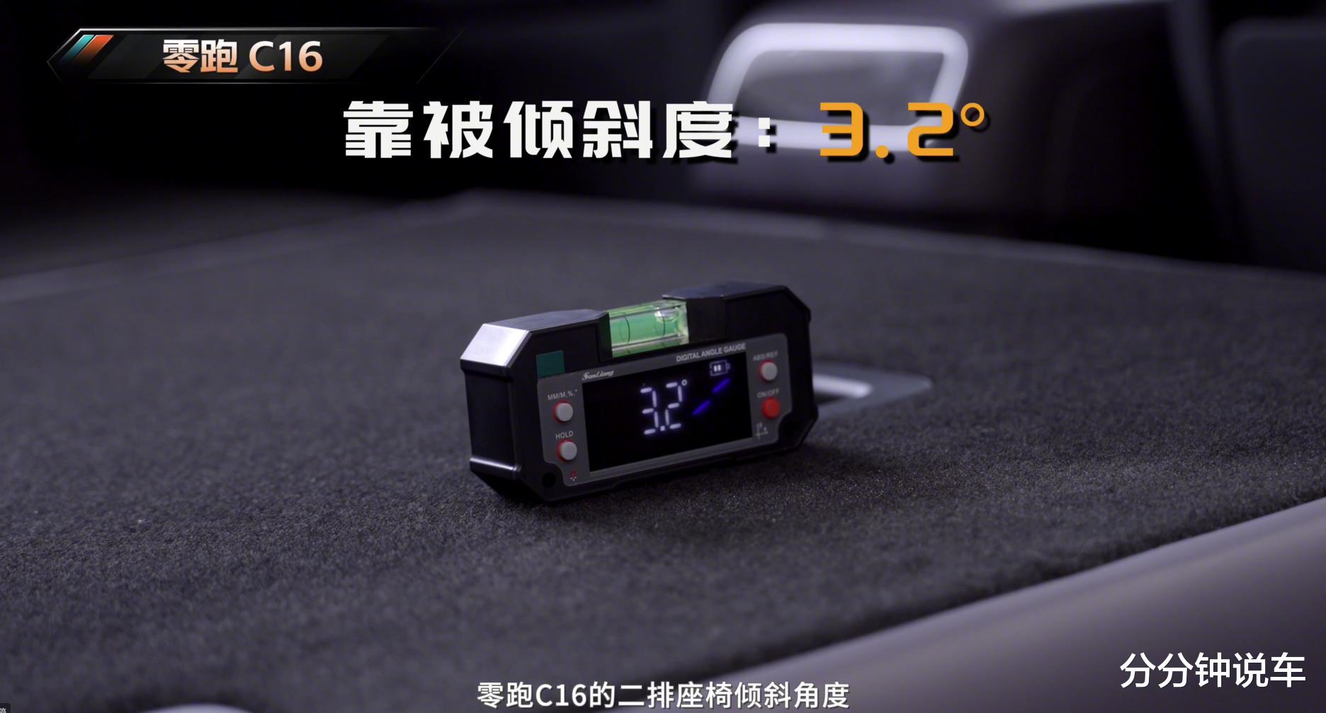 最后一项测试是测试车辆二排座椅放倒之后的平整度,更纯平的二排,可以带来更舒适的躺平空间。实测数据显示,零跑C16同样没有让人失望,以仅3.2度的倾斜度,与其他10款车型拉开差距,从视觉上看,几乎就是纯平的空间。