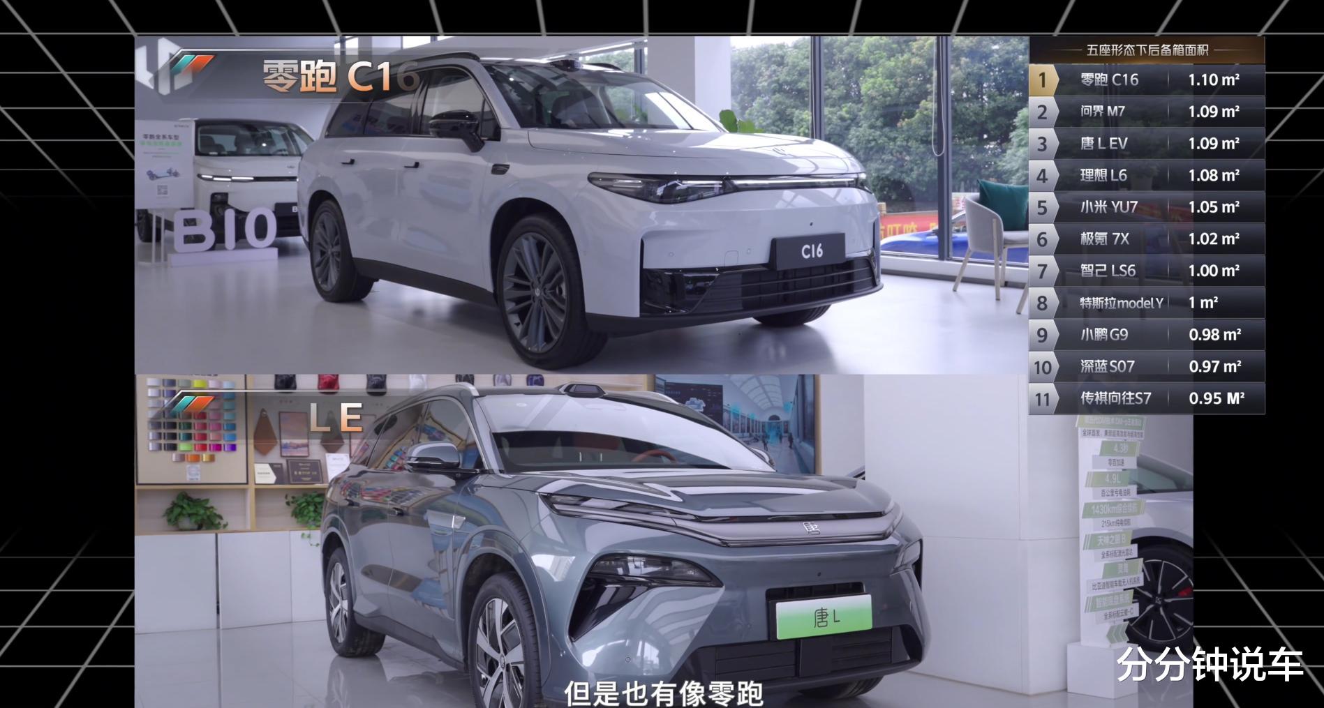 一向在空间层面被看好的理想L6和唐L EV在该项测试中,虽说实测数据都不弱(前者后备厢面积1.08平米,后者1.09平米),排名也很靠前,但无奈遇到了零跑C16这一强劲对手,在实际可用的后备厢面积上,均小于零跑C16。