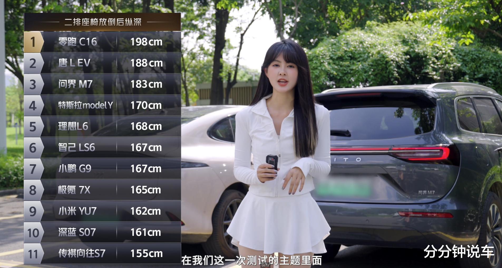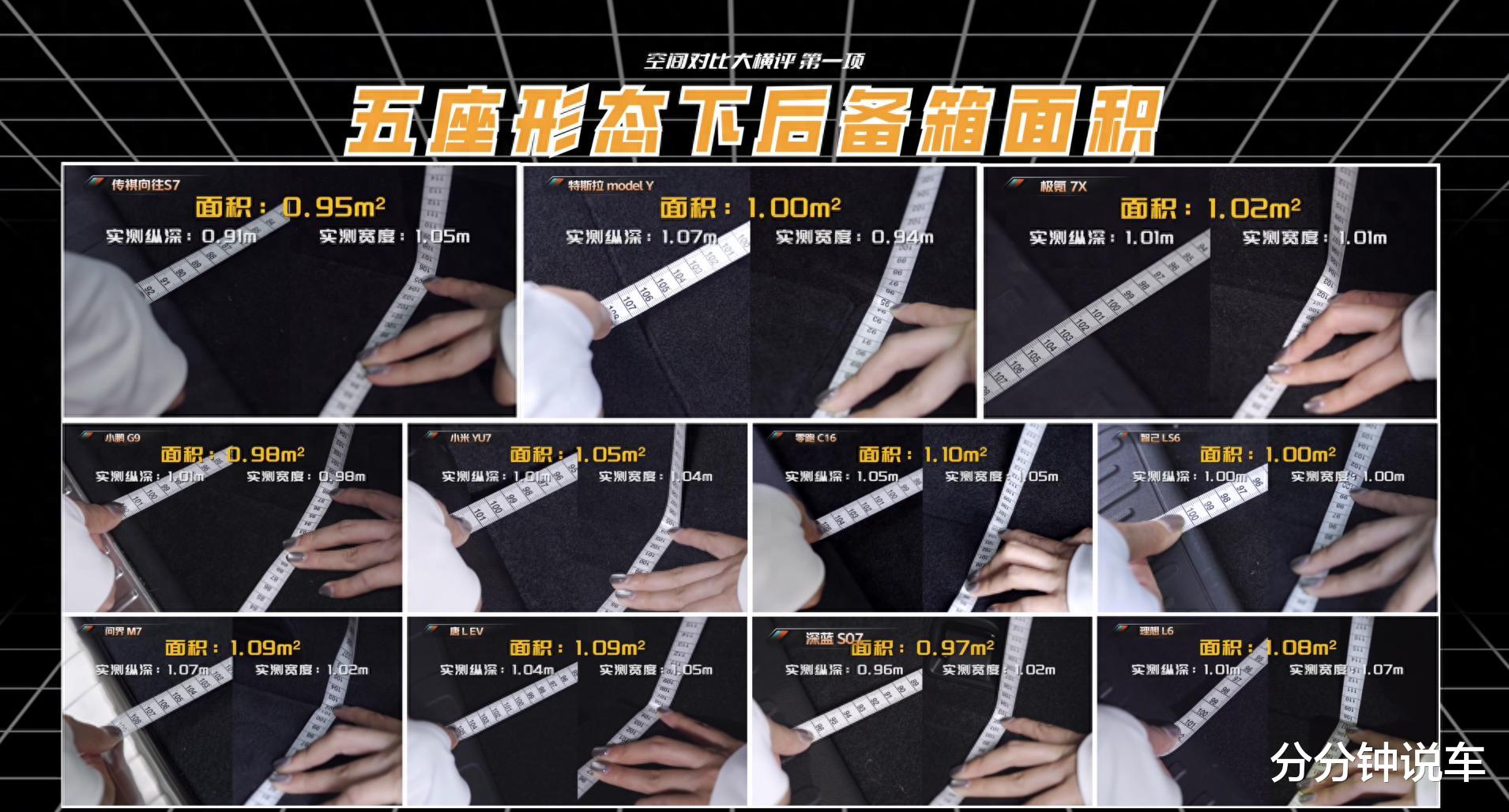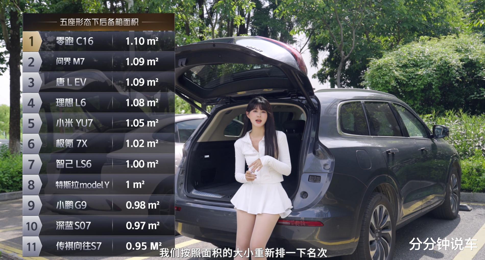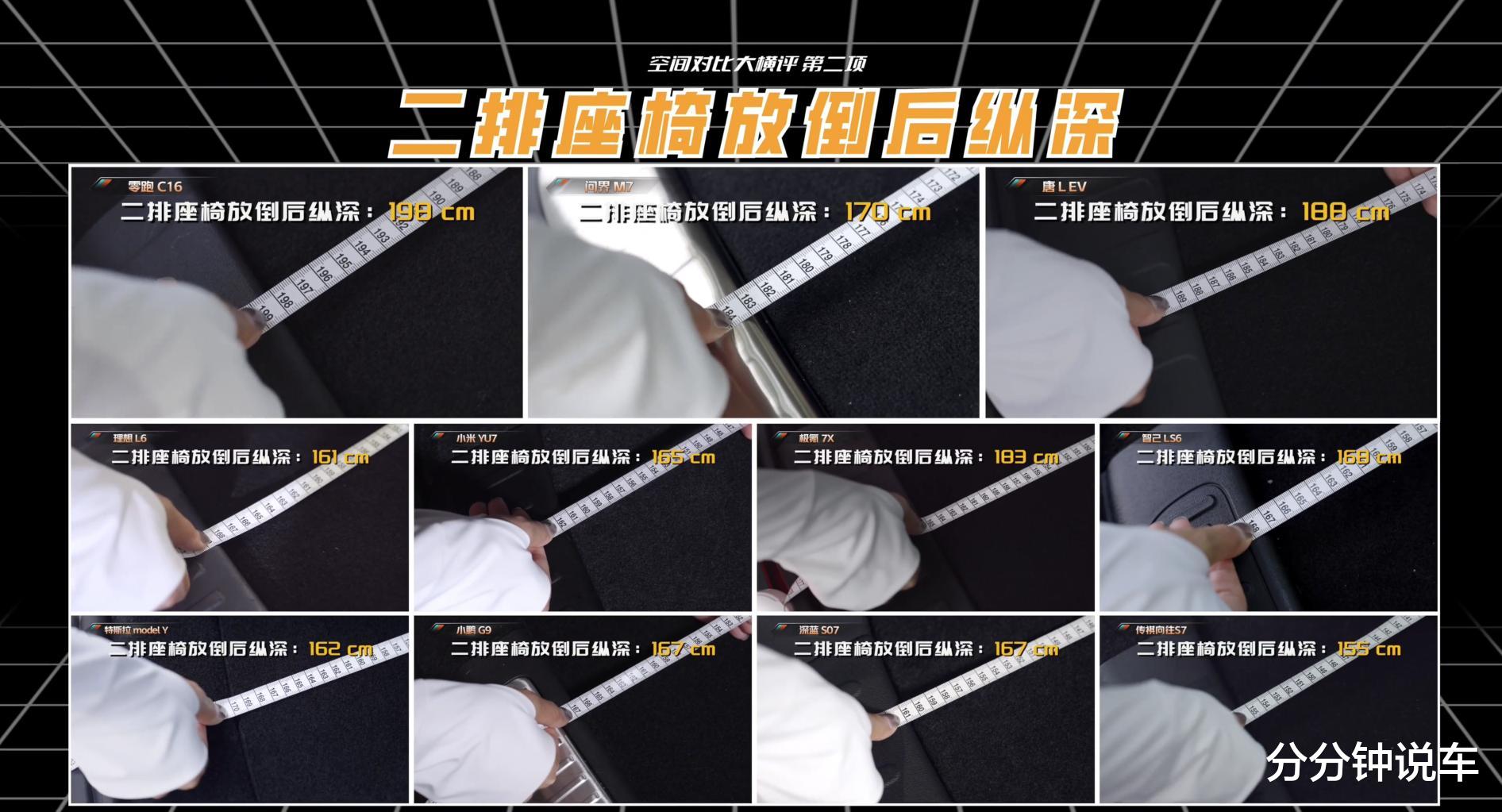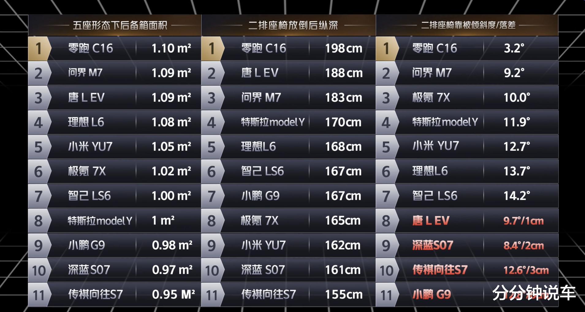 这家媒体围绕关乎装载能力,关乎户外出游时,后排座椅放倒之后的舒适性,进行后备厢面积、二排座椅放倒后纵深、二排座椅靠背倾斜度/落差等进行了实测。本次参与实测的车型覆盖了市面上主流的大尺寸SUV,分别是零跑C16、比亚迪唐L EV、理想L6、问界M7、极氪7X、智己LS6、小米YU7、特斯拉Model Y、小鹏G9、广汽传祺向往S7、深蓝S07共计11款车型,所以这次的对比就非常有看点和实际意义,接下来我们逐一解析。