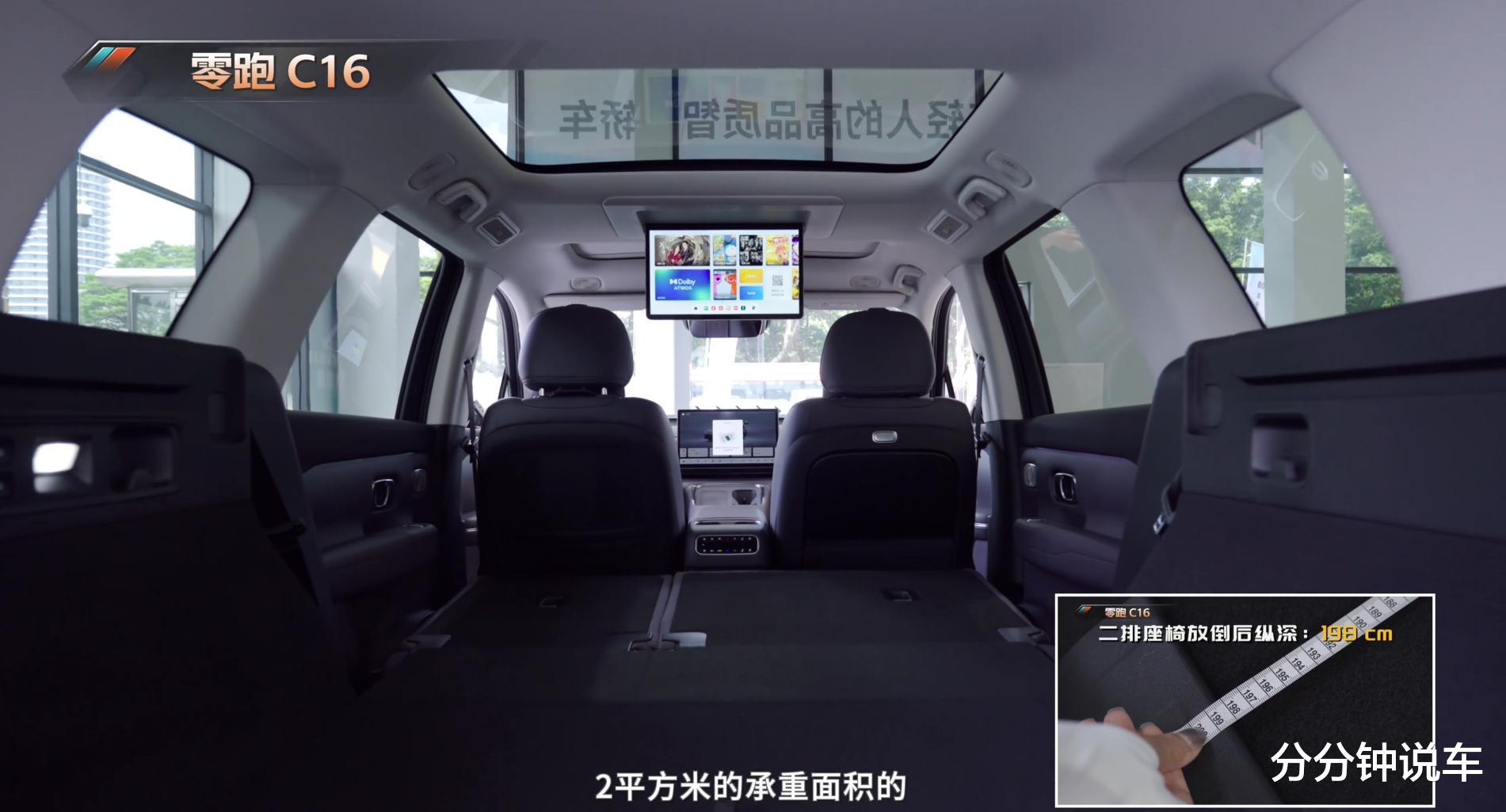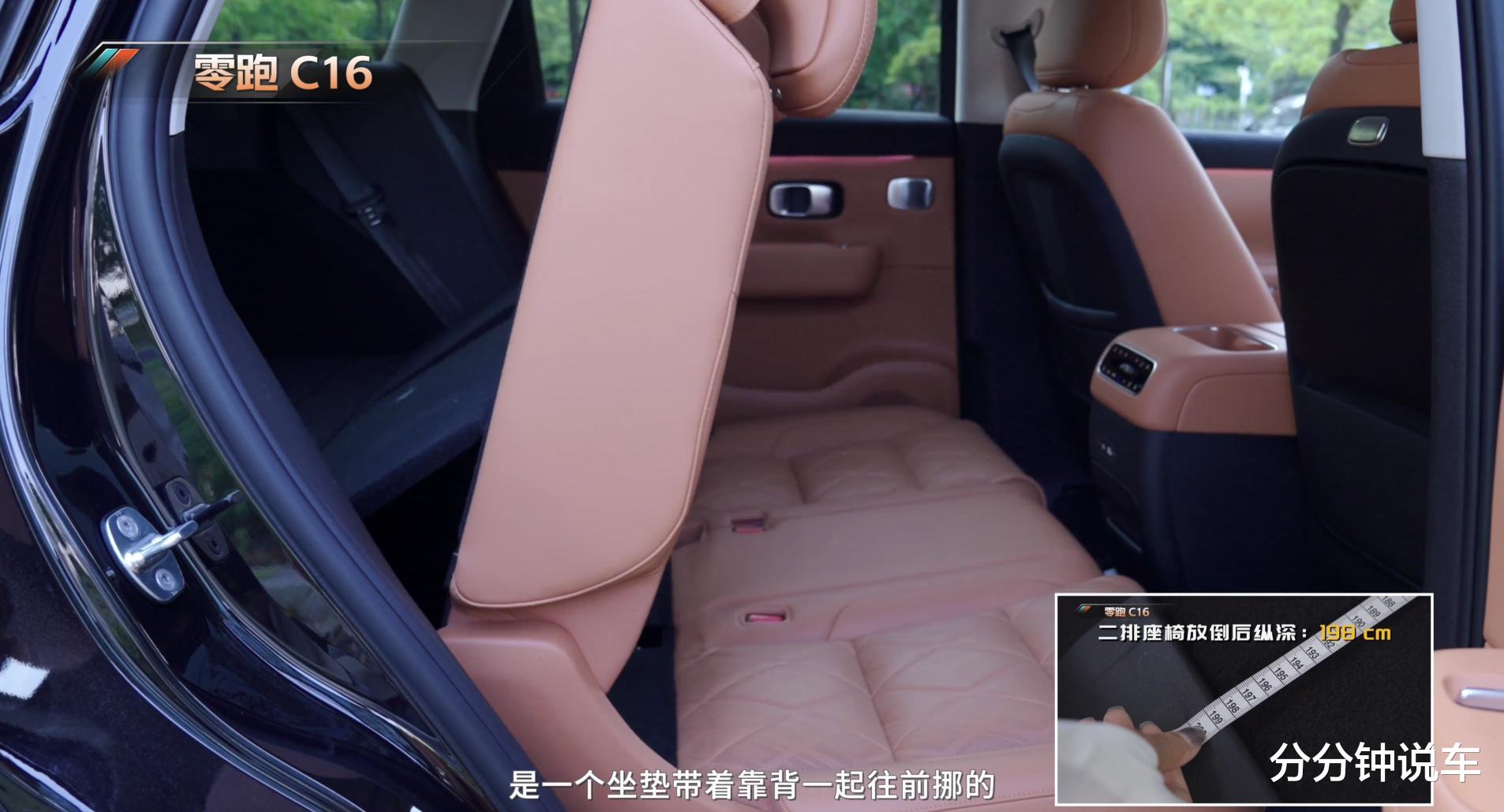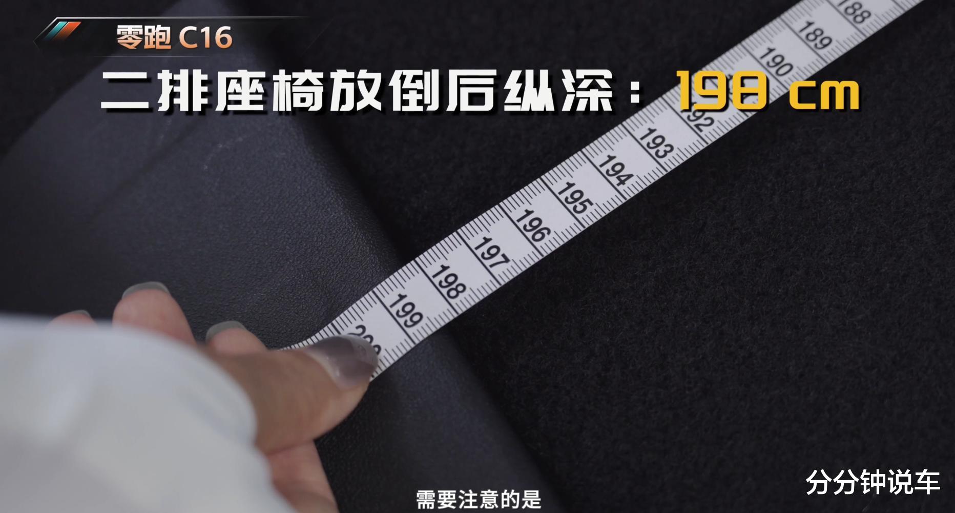 我们依旧先说结果,零跑C16凭借二排座椅放倒后纵深达到了198cm的数据,领先参与测试的11台车型,接近2米的纵深,几乎就是一张非常标准的豪华酒店大床的尺寸了。对比理想L6(161cm)和唐L EV(188cm),在实测数据上,这次零跑C16的优势更为明显。