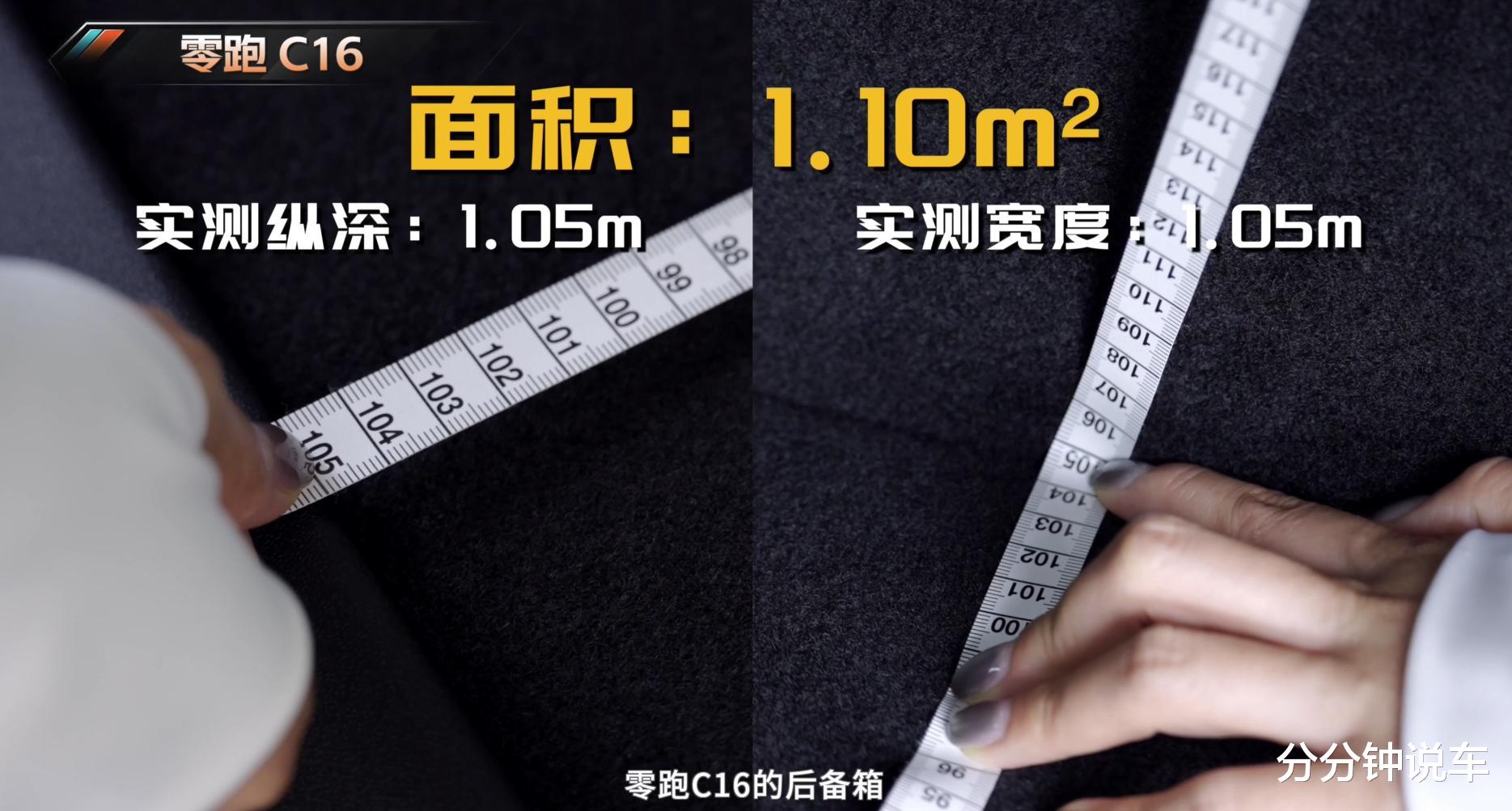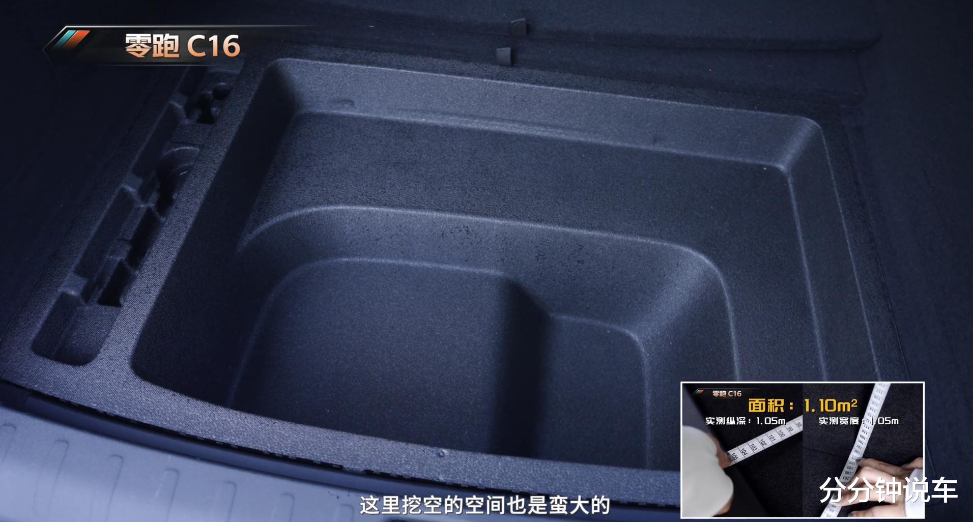 首先在后备厢面积方面,该媒体实测了每台车的后备厢宽度和纵深,最终得出后备厢面积。先说结果,零跑C16在参与实测的11台车型中,后备厢面积最大,达到了1.10平米,并且通过实测画面也可以看到,其后备厢纵深和宽度均为1.05米,空间布局十分规整,并且还设置了一个非常可观的后备厢下沉空间,可以放置一些相对隐私的物品或者随车工具,可以说丝毫不浪费一点空间,尤其是如果你要装载一些大件物品的时候,更规整的空间也便于取放。