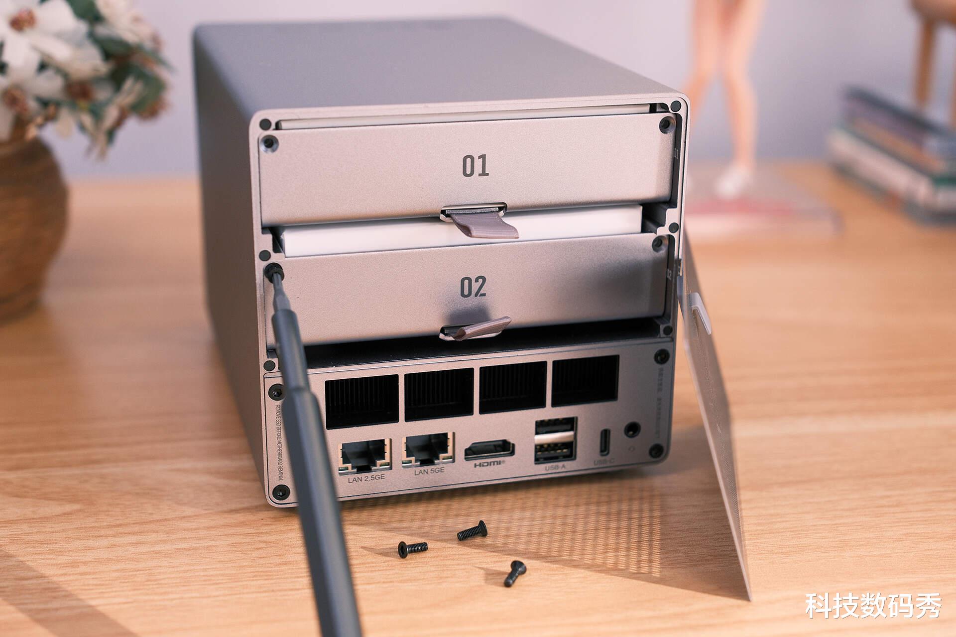 硬盘安装其实也没什么难的,将主机身旋转至后面背板,背部上侧的金属网是磁吸的,轻轻一拉就能取下来,然后很直观的看到内部有两个硬盘位分别是01和02,拉手也说明这是抽屉式的开合方式,不过在拉出前我们把左右各两个螺丝用内六角工具取下来(可以用你自己的工具,没有的话在机身的底部有配套内六角工具)。