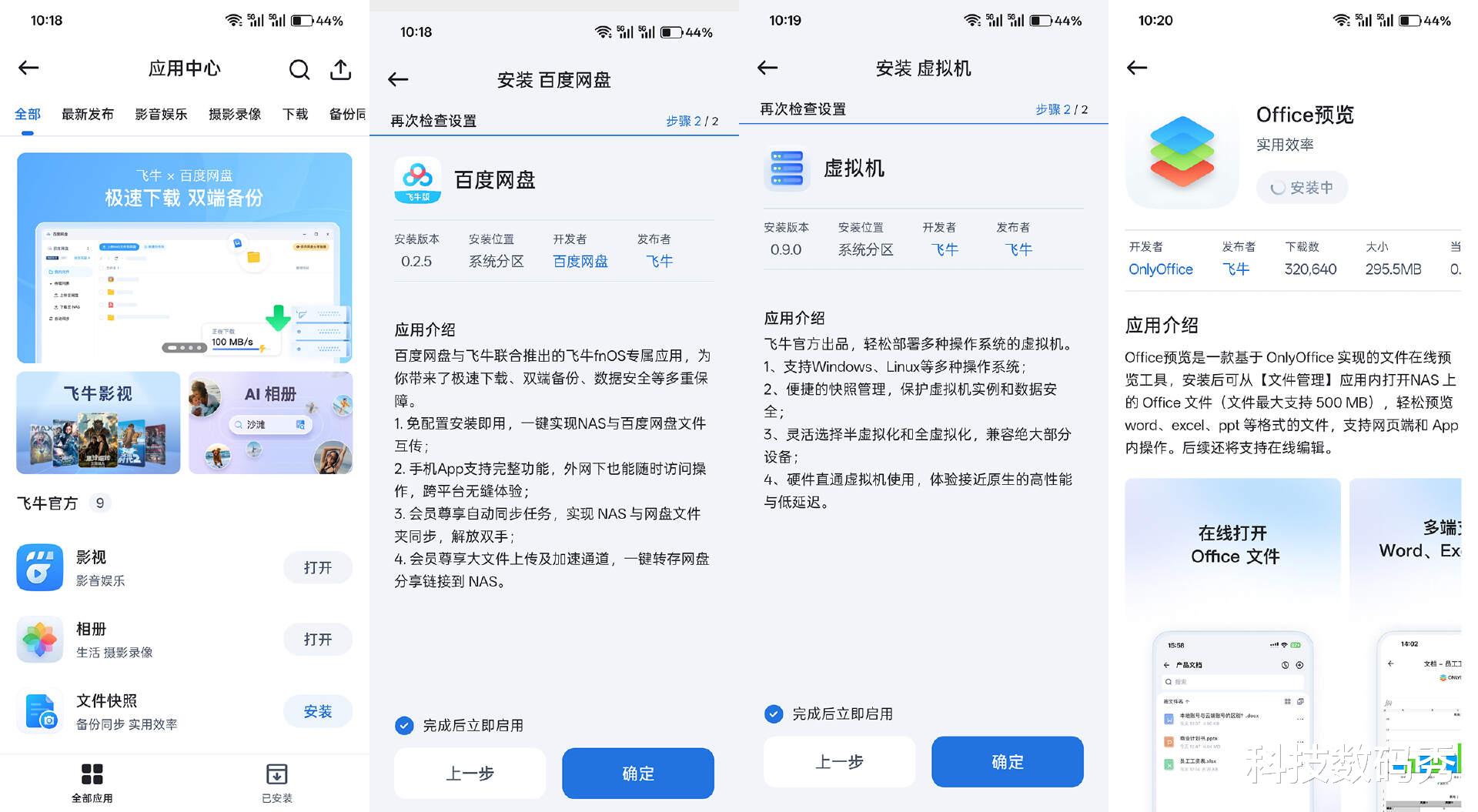 在应用中心里,可以直接安装的官方应用有9个,分别是影视、相册、文件快照、虚拟机、iSCSI、Office预览、百度网盘、飞牛同步、文本编辑器。如果你想下载更多的社区应用,那就点击主界面的Docker创建容器,然后像各种音乐软件、迅雷、磁力下载软件、花生壳、FTP等等就可以随心下载了。