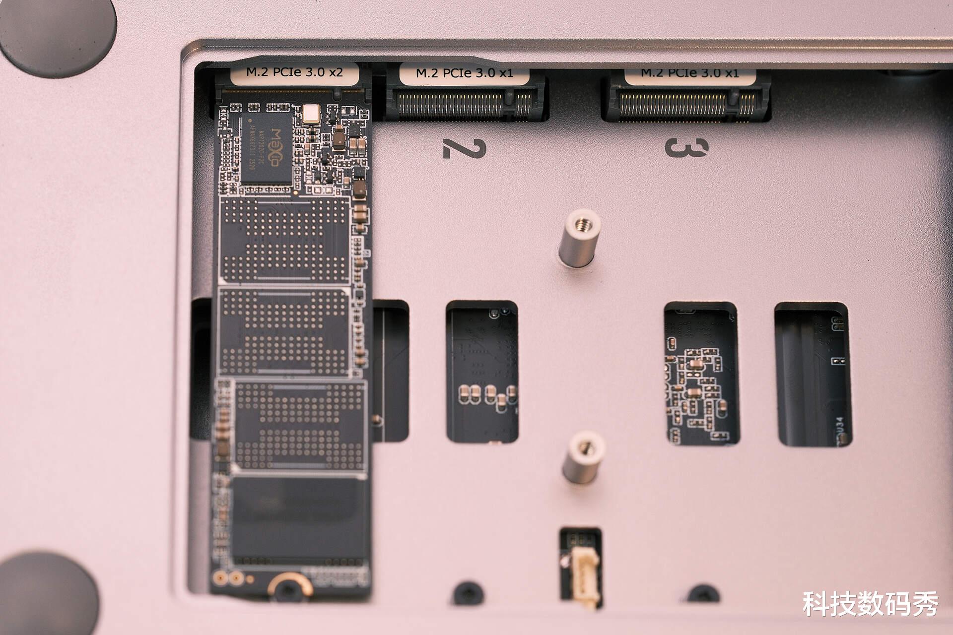 除了背部的两块机械硬盘位之外,在机身的底部把硅胶垫扣下来,拧下底部金属板的两颗螺丝之后,就能看到官方自带的128G系统盘了,其中这3个M2卡槽,其中第一个盘位是PCIe3.0 x2,另外两个是PCIe3.0 x1,单条SSD最高支持4TB扩容,无论是机械硬盘位还是固态硬盘为,背板上都自带了导热硅胶,这点是无需用户准备的。