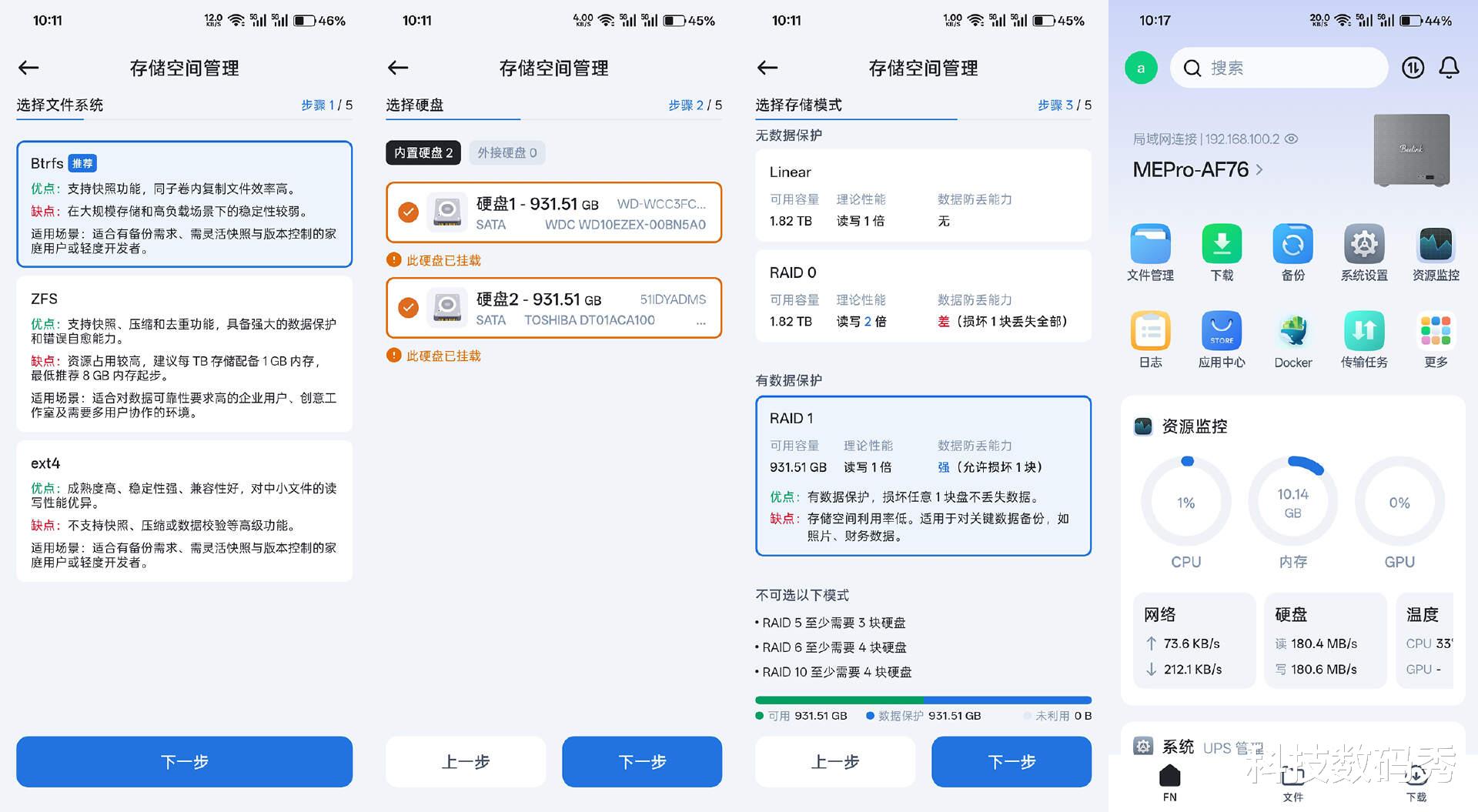 扫描说明书上的二维码,或者直接在应用商店下载“飞牛”App,当手机和零刻ME Pro处于同一网络下时,App会自动找到设备并进行存储空间的创建和账号绑定,创建存储空间的方式看个人习惯,系统提供了3种文件系统的选择,并且对于双盘位可以软件组RAID 0或者RAID 1,主要看你对于数据存储的重要性,像平时如果只是用来做电影海报墙娱乐观影使用的话,RAID 0就OK,如果你是用来存储工作资料或者个人重要相册文件,那就组RAID 1有数据保护,两块硬盘损坏其中任意一块都不会丢失数据。