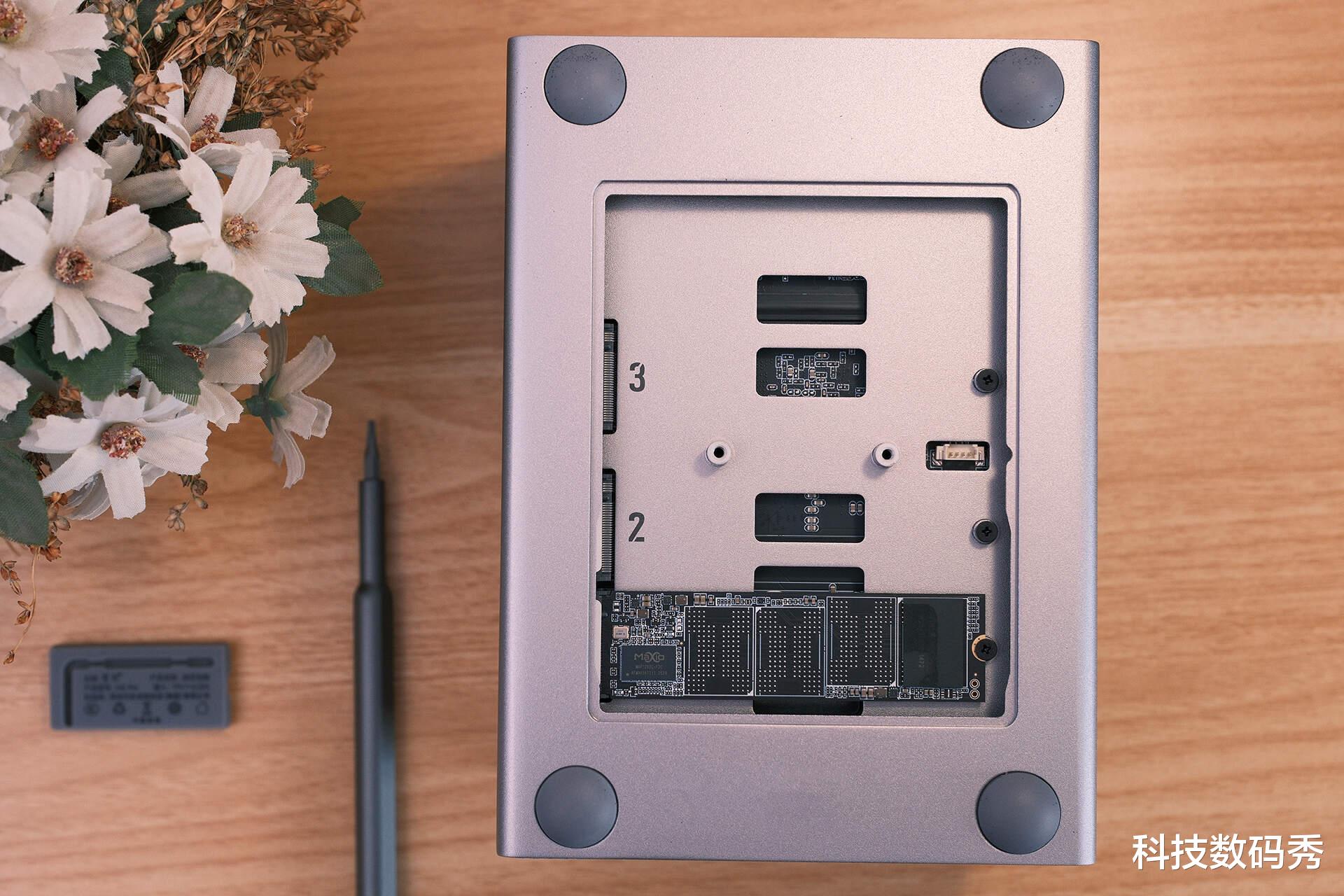 官方也是很巧妙的把电源、HDMI数据线、网线、硬盘固定螺丝等配件放入了这两个抽屉里,之前还有朋友问电源线去哪了,哈哈,硬盘抽屉柜打开的时候你就看到了。现在硬盘内存条价格都涨飞了,好在我手里还有之前台式机淘汰下来的几块硬盘,这不就用上了!那这两个硬盘位既可以装3.5英寸硬盘,也可以装2.5英寸硬盘,单盘位最高支持30TB扩容,能看到铝金属支架和SATA硬盘之间还有一层导热硅胶,加上内置的鼓风机风扇,保证良好的散热效果。