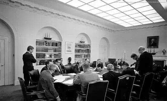 1962年10月,美国时任总统约翰·F·肯尼迪在白宫与国家安全委员会执行委员会成员就古巴危机开会谈论