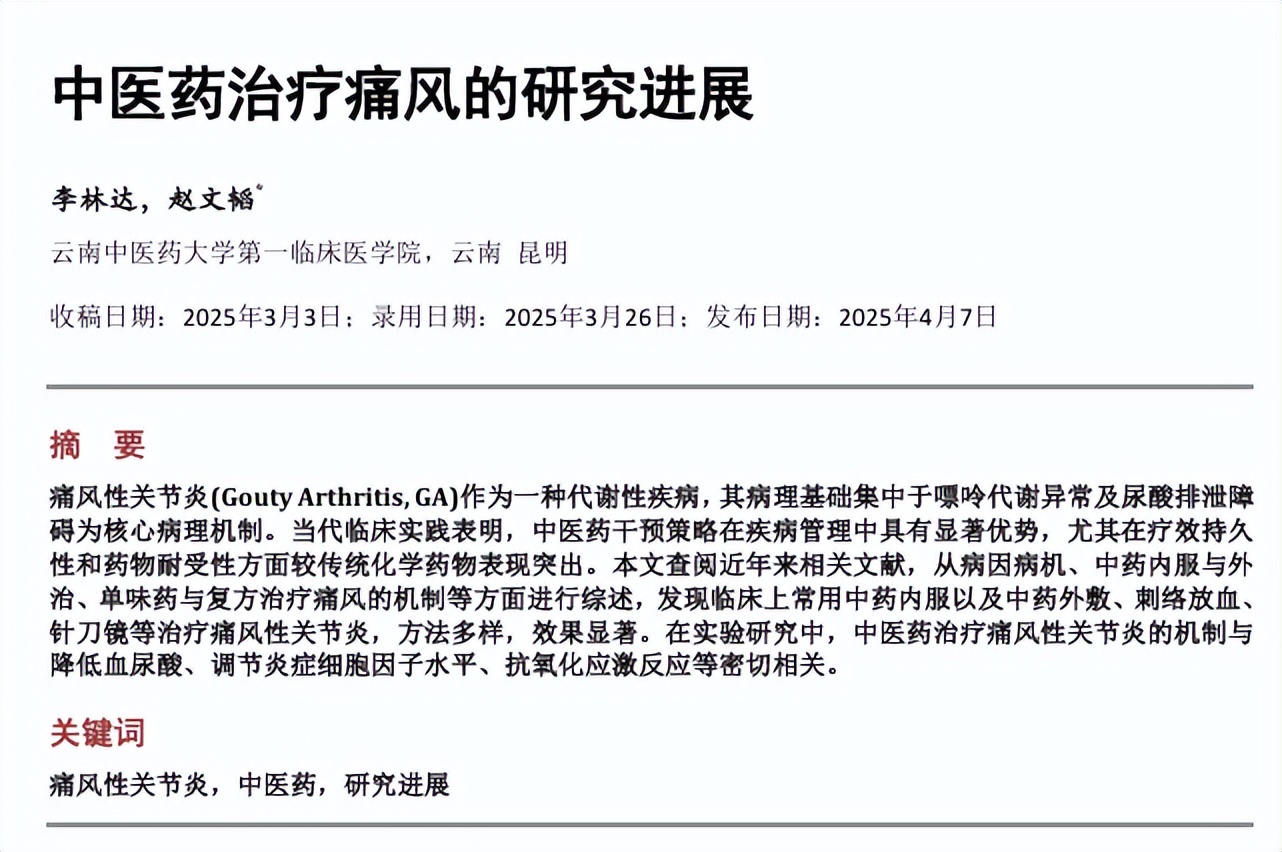 参考资料[1]李林达, 赵文韬. 中医药治疗痛风的研究进展[J]. 临床医学进展, 2025, 15(4): 789-796.