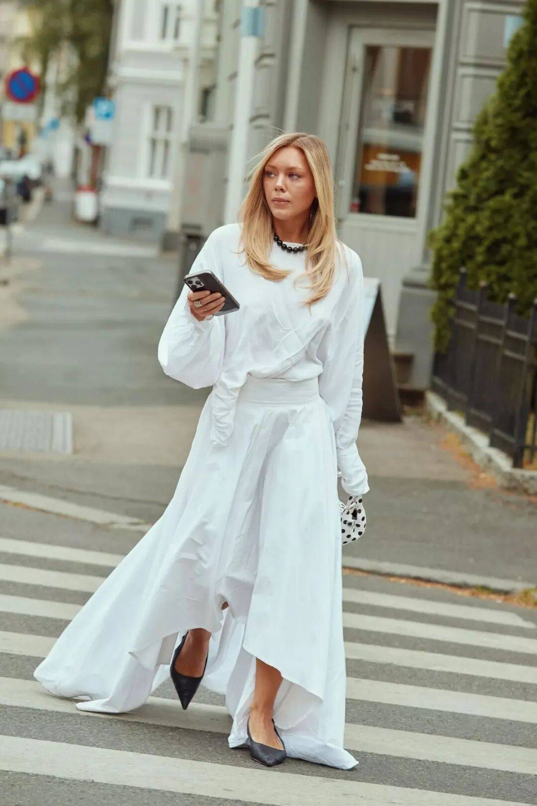 如果想让白色不至于过于单调,可以在裙身加入一些褶皱设计,或者选择带有细微纹理的面料,让白色拥有层次,而不是一片空白。