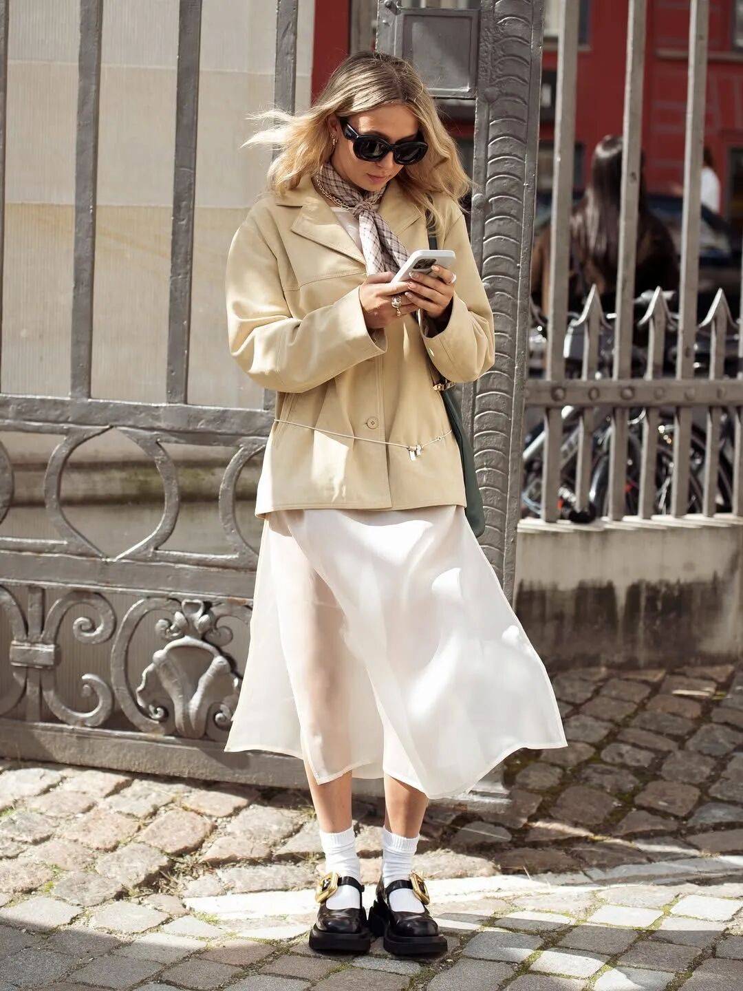 短风衣与白半裙搭配时,最推荐选择卡其、棕、驼等秋日色调。