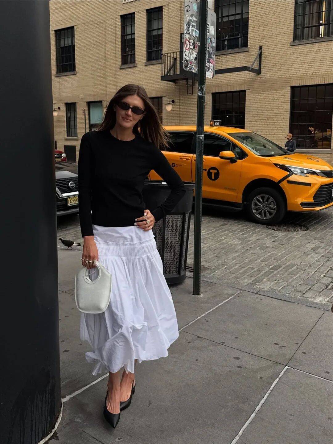 白半裙轻盈感的关键,还在于上衣的呼应。早秋的针织衫、薄衬衫都能与白色半裙形成和谐的呼吸感。