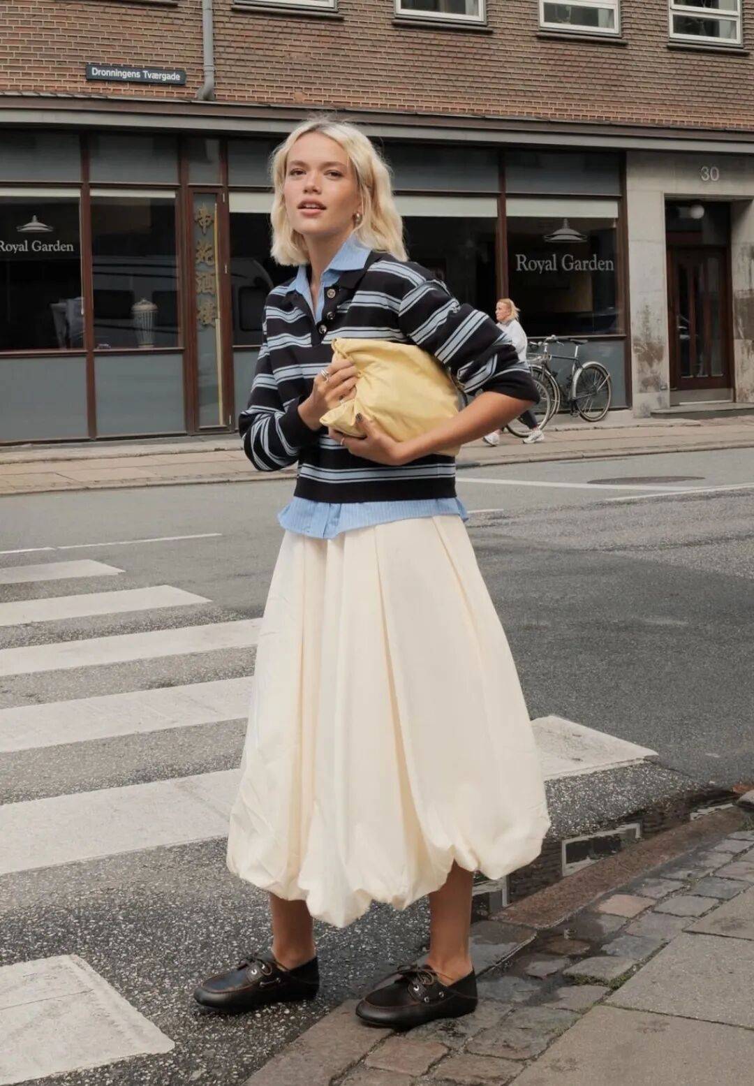 要在秋天穿好白色半裙,首先要把控它的量感。