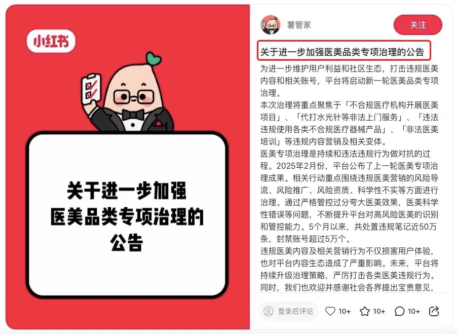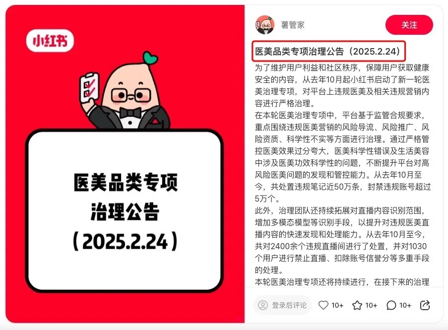 2025年2月24日小红书发布《医美品类专项治理公告》