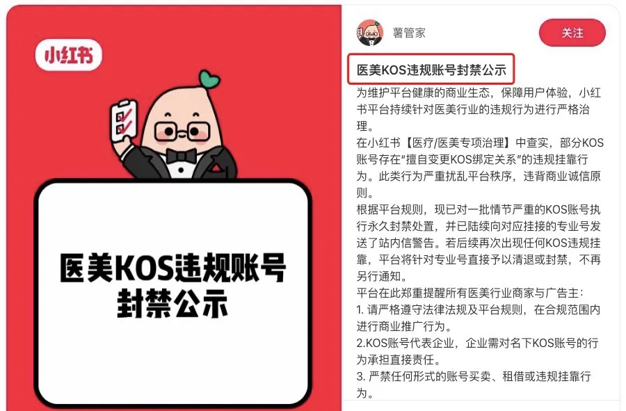 11月17 小红书发布《医美KOS违规账号封禁公示》。