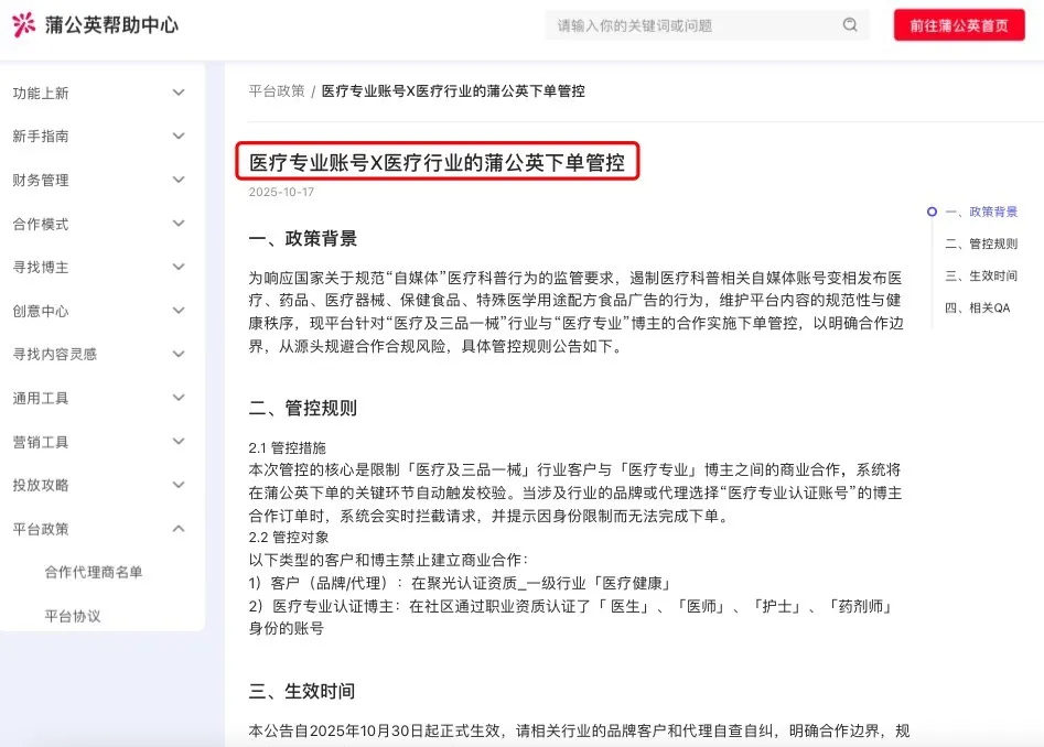 10月17日小红书蒲公英平台发布的《医疗专业账号X医疗行业的蒲公英下单管控》,已于10月30日正式执行。相关小红书官方Q&A见文末附件一