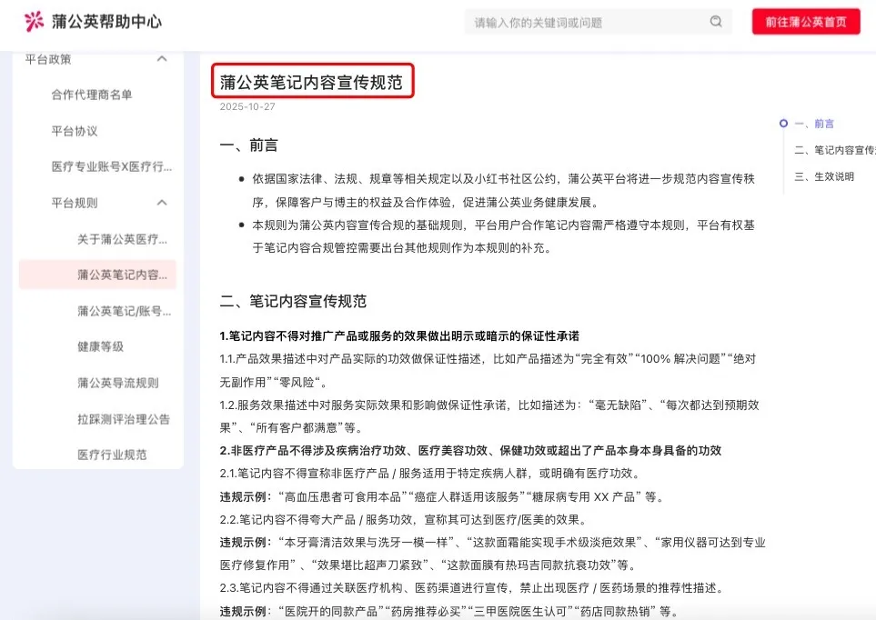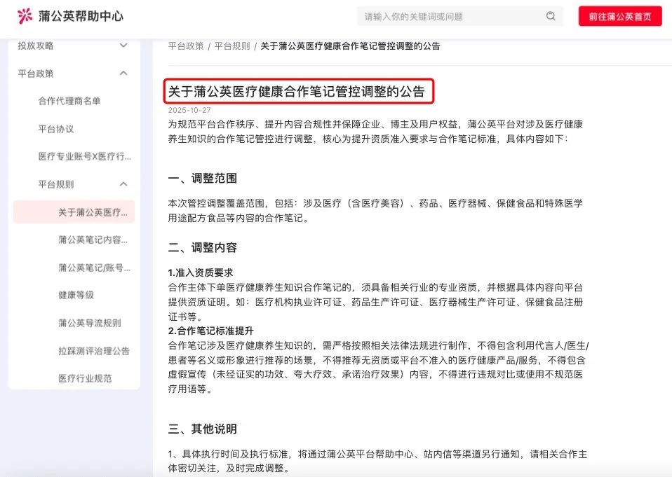 今年10月27日小红书蒲公英平台发布的《关于蒲公英医疗健康合作笔记管控调整的公告》和《蒲公英笔记内容宣传规范》对医美类合作笔记实施更为严格的管控。