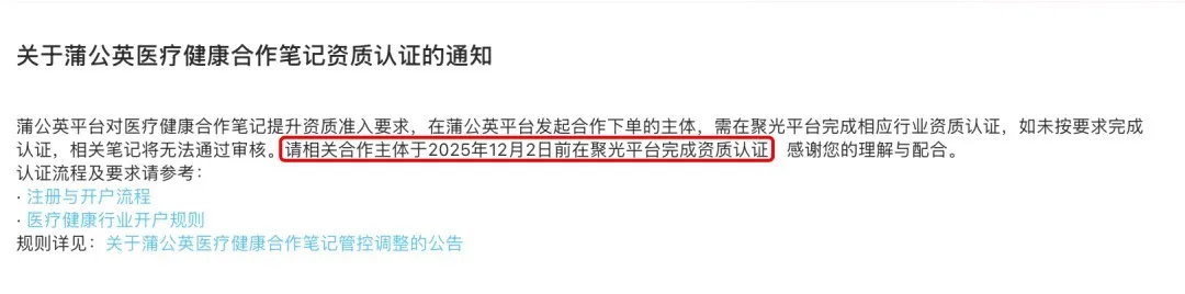 小红书在近日推送的《关于蒲公英医疗健康合作笔记资质认证的通知》中明确:蒲公英平台(小红书官方推出的品牌与博主商业合作对接平台)对医疗健康合作笔记提升资质准入要求,在蒲公英平台发起合作下单的主体、需在聚光平台完成相应行业资质认证,如未按要求完成认证,相关笔记将无法通过审核。请相关合作主体于2025年12月2日在聚光平台完成资质认证。
