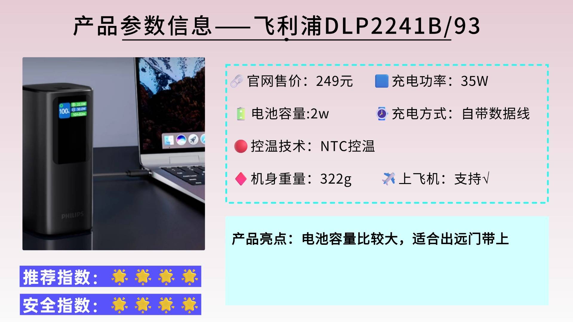 西圣Pro充电宝可以说是百元价位中天花板级别存在了,充电效率不仅快,在控温、散热上也做的十分优秀,配备三重散热技术,分别是NTC和MPC智能控温阵列,并且通过Air-DDVT双风道散热结构在快充时保证安全性!并且通过了新国标3C认证,搭载了9重安全防护机制,对比同等价位充电宝品牌,安全性能配置直接拉满!