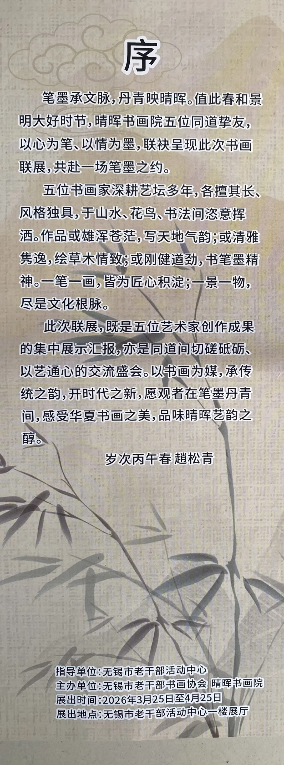 指导单位:无锡市老干部活动中心主办单位:无锡市老干部书画协会晴晖书画院展出时间:2026年3月25日至4月25日展出地点:无锡市老干部活动中心一楼展厅