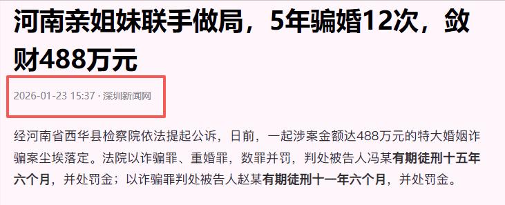 信源:深圳新闻网 2026-01-23 ,河南亲姐妹联手做局,5年骗婚12次,敛财488万元