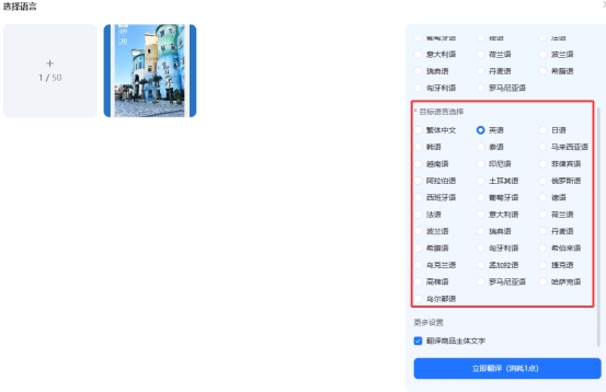 ①选择图片原语言:上传图片后选择对应原始语言,例如简体中文