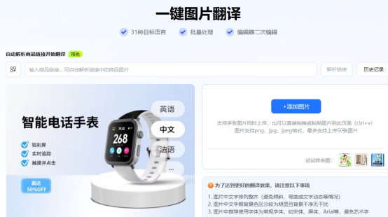 对于需要处理商品图片或电商素材的用户来说,易可图提供的图片翻译功能可以直接识别并翻译图片中的文字,目前支持31种目标语言,适用于多语言商品展示场景。基本使用流程如下: