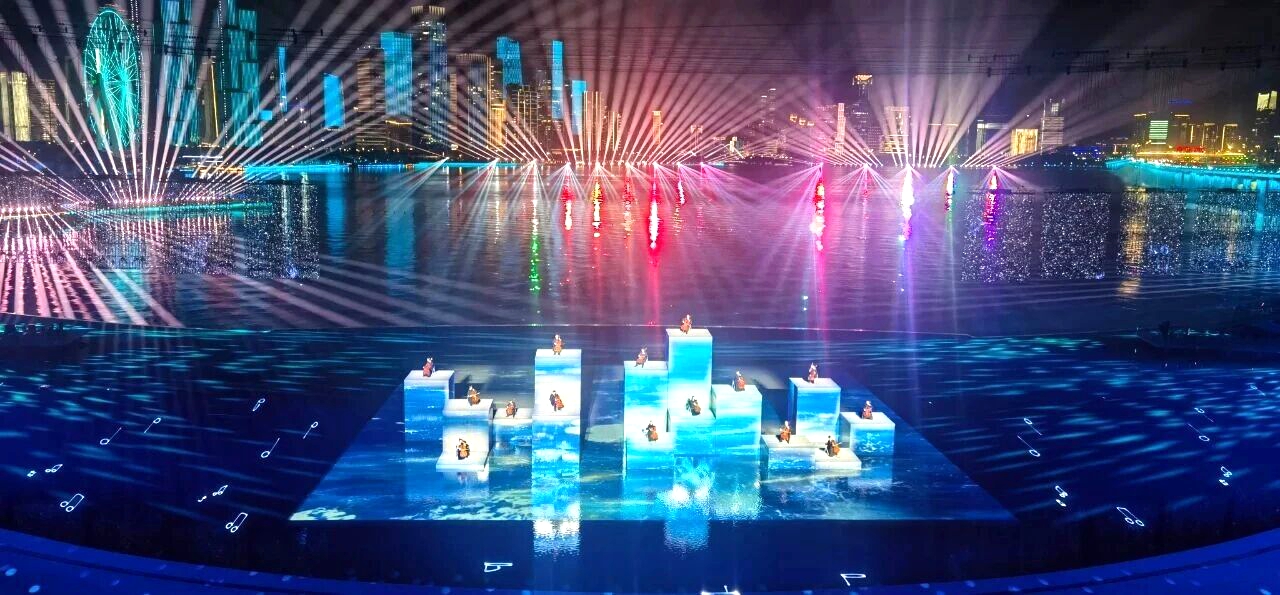 闭幕式以“星辰大海”为主题,打造全球首个滨海实景“城市全景闭幕式”,舞台主体结构被设计为一张象征性“纸”的造型承载湾区文化,在文体展演中通过视觉效果呈现动态变化,既可呈现破水而出的视觉效果。