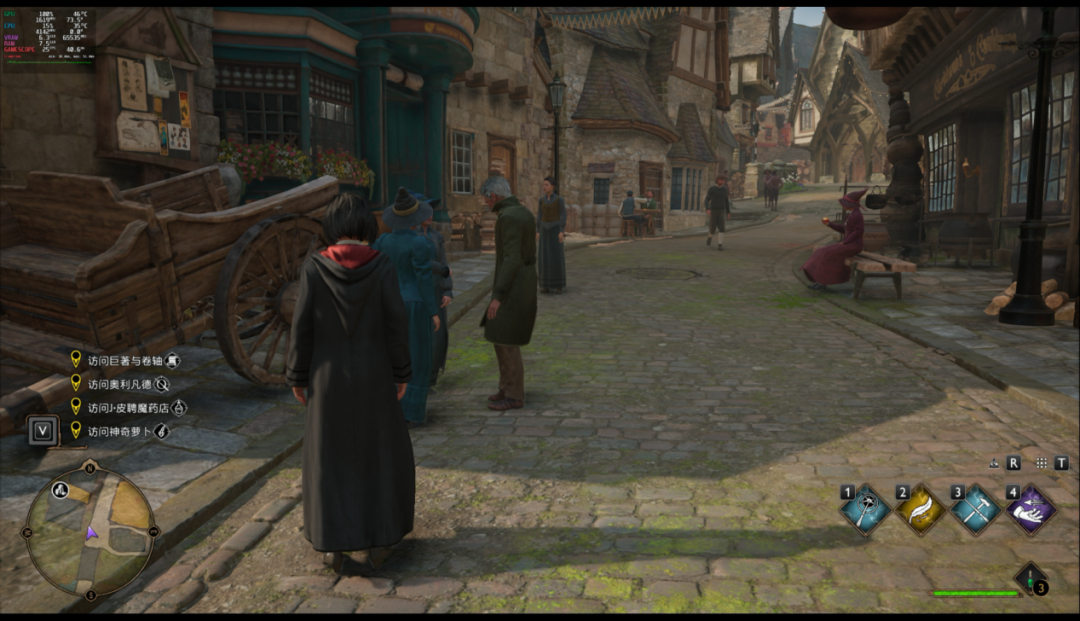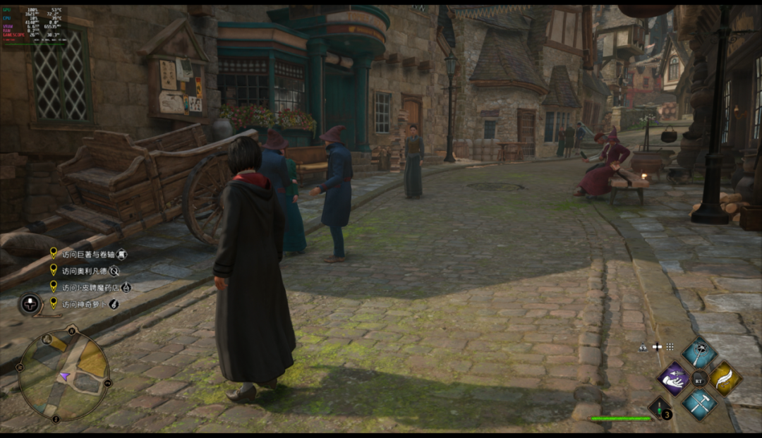 ▲在16GB内存、1080P+低画质设置下,玩《霍格沃兹之遗》的系统内存占用大概7.5GB左右(平均25fps)