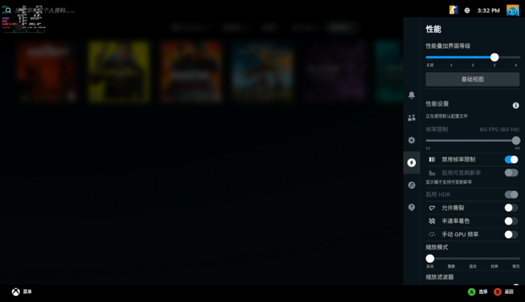等SteamOS启动完毕,登录自己的账号即可使用。在SteamOS下,呼出控制面板菜单可以通过XBOX标准手柄同时按下“西瓜键”+ A来实现,在这里我们就可以开启系统监控,查看内存占用量。