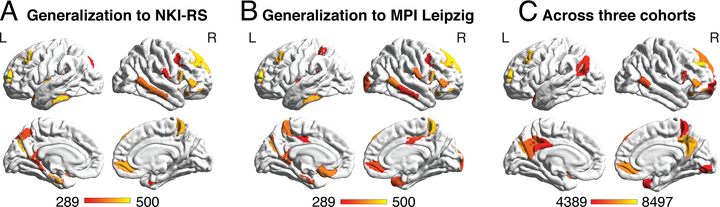 接下来,我们使用一致性分析检验了在 HCP 数据中识别出的区分性特征向独立 NKI-RS 和 MPI Leipzig 队列的泛化能力(详见 SI 附录补充方法)。简而言之,对于每个队列,我们使用了在 HCP session 1 数据上训练的 500 个 stDNN 模型,应用 IG 方法估计每个脑区和时间点的特征归因,然后识别出排名前 20% 的特征。在每个队列内,我们跨受试者汇总了这些特征,并应用二项式检验来确定最一致的区分器。