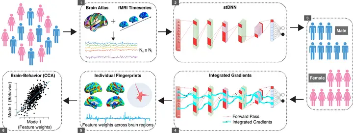 我们采用时空深度神经网络和可解释人工智能技术的方法,识别出了跨多个数据集和独立队列的人类功能性大脑组织中可重复、可泛化且可解释的性别差异,并且进一步揭示了存在性别差异的功能性大脑特征与行为相关。最后,我们证明了我们的方法相对于传统机器学习方法的优势。