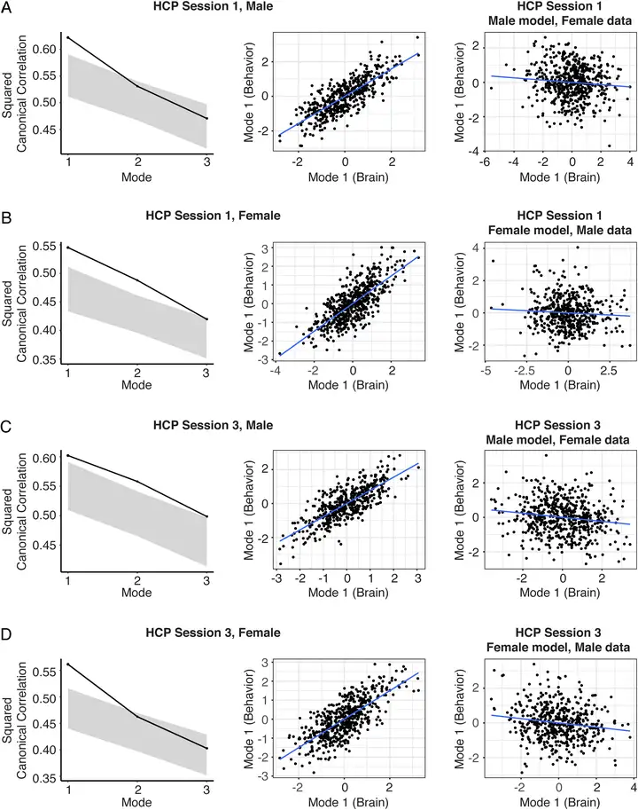 ▲(A) 基于HCP session 1数据中男性建立的CCA模型,能够预测男性的认知特征,但不能预测女性的认知特征。