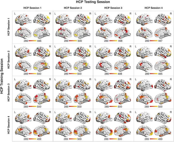 接下来,我们试图识别出最能稳定区分女性和男性大脑的大脑特征。为此,我们在四个 HCP session 的每一个中,使用多次五折交叉验证迭代进行了一致性分析,旨在识别不受任何单一数据交叉验证分割影响的特征。简而言之,对于每个 HCP session,我们在特定 HCP session(模型 session)的不同子集上训练了 500 个模型,用于计算特定 HCP session(测试 session)中所有受试者的基于 IG 的特征归因,从而得到测试 session 的 500 组特征归因(详见材料与方法)。然后,我们识别出每组中排名前 20% 的特征,统计它们在所有组中出现的次数,并使用二项分布设定阈值。对所有 HCP session 配对重复此过程,最终得到 16 个一致性图谱(4 个 HCP 模型 session × 4 个 HCP 测试 session;图 4)。在所有 16 个一致性图谱中,我们确定楔前叶、腹内侧前额叶皮层、腹外侧前额叶皮层、背外侧前额叶皮层和颞上回是最稳定贡献于性别差异的大脑区域(图 4 和 SI 附录,表 S3)。