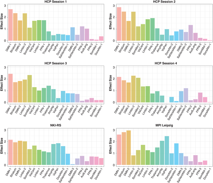 ▲大脑网络的排序基于其在 4 个 HCP session 以及两个独立队列(NKI-RS 和 MPI Leipzig)中效应量的大小排名。这 20 个网络包括 17 个皮层网络 (65) 和三个皮层下网络(涵盖纹状体、杏仁核-海马和丘脑)(SI 附录,表 S18)。背侧默认模式网络在所有网络和队列中显示出最大的效应量(Cohen's d > 2),其次是纹状体和边缘网络(d > 1.5)。排序顺序:DMN-1 = 背侧默认模式网络;Striatum = 纹状体;DMN-2 = 腹侧默认模式网络;Limbic-2 = 边缘网络;SomMot-2 = 躯体运动网络;VisCent = 视觉中央网络;Limbic-1 = 边缘网络;FPN-1 = 额顶网络;Thalamus = 丘脑;Amy-Hip = 杏仁核-海马网络;VisPeri = 视觉外周网络;DorsAttn-2 = 背侧注意网络;SalVentAttn-1 = 突显/腹侧注意网络;DMN-3 = 默认模式网络;SalVentAttn-2 = 突显/腹侧注意网络;FPN-2 = 额顶网络;AudLang = 听觉语言网络;FPN-3 = 额顶网络;SomMot-1 = 躯体运动网络;DorsAttn-1 = 背侧注意网络。