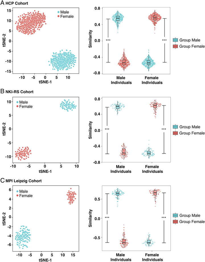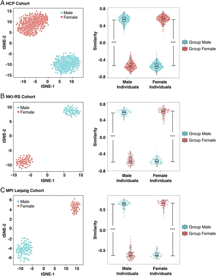 我们使用针对 HCP 队列描述的相同独特性分析方法,评估了 NKI-RS 和 MPI Leipzig 队列中区分女性和男性的大脑特征的有效性(详见 SI 附录补充方法)。