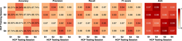 ▲Fig2:在每一个 HCP session 数据上进行的五折交叉验证分类性能,以及模型在无需任何额外训练的情况下,于其他三个 HCP session 中的可重复性。对于五个性能指标(准确率、宏精度、宏召回率、宏 F1 分数和 AUC)中的每一个,我们都在一个矩阵中展示了成对的平均性能结果。矩阵中的行指 HCP 训练集 session(即 stDNN 模型是在哪个 session 上训练的),列指 HCP 测试集 session(即 stDNN 模型在哪个 session 上进行测试)。
